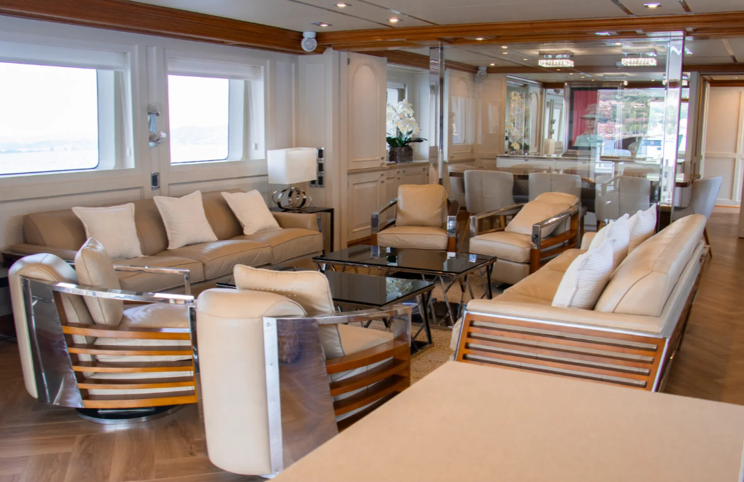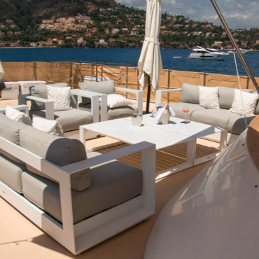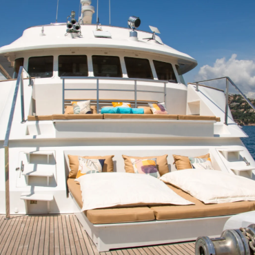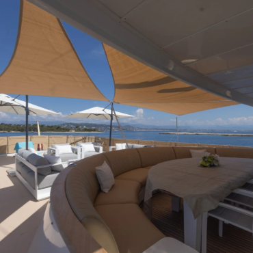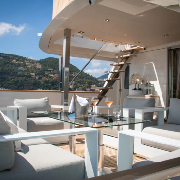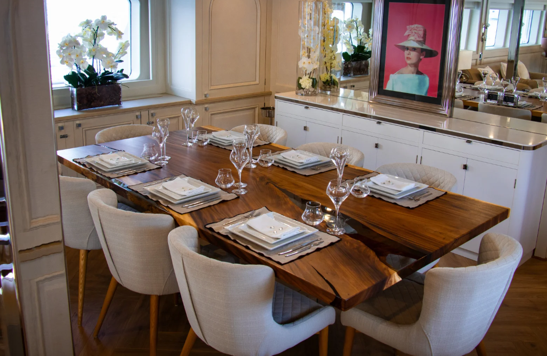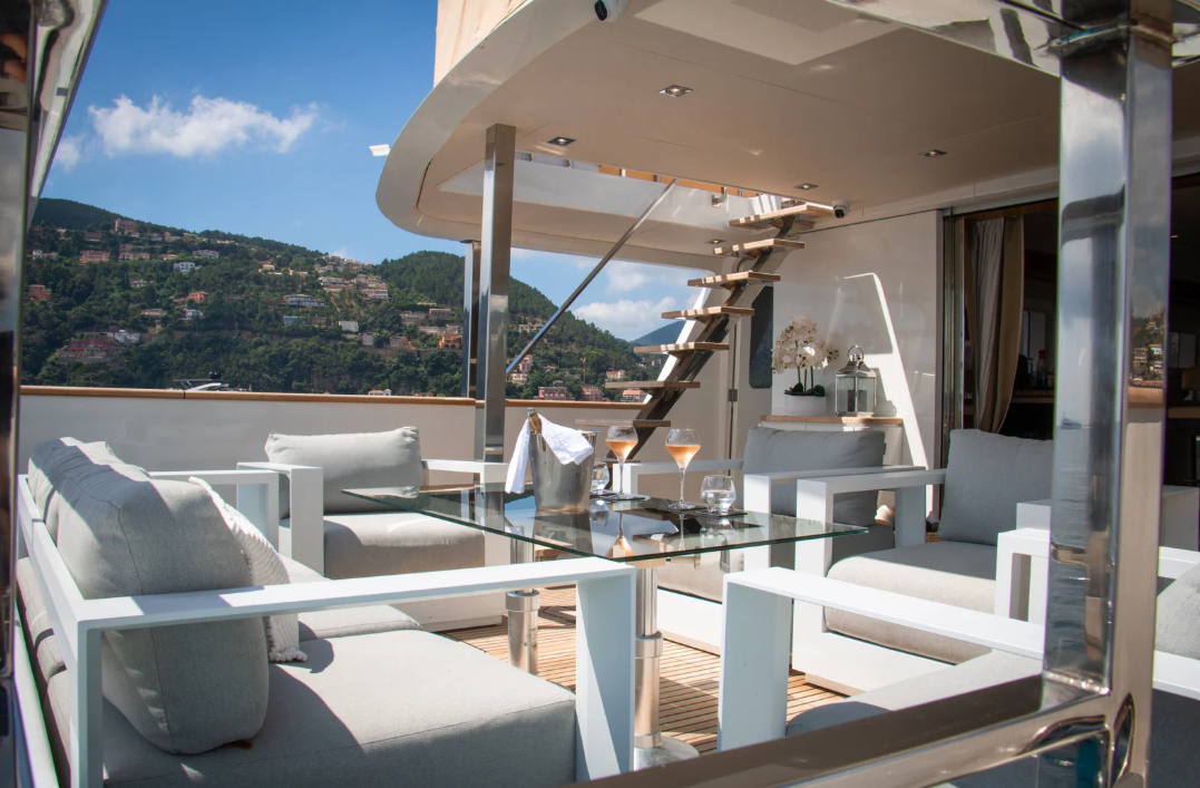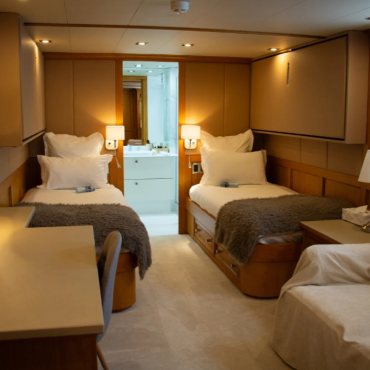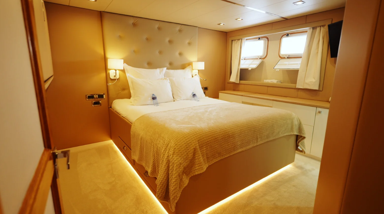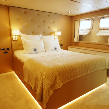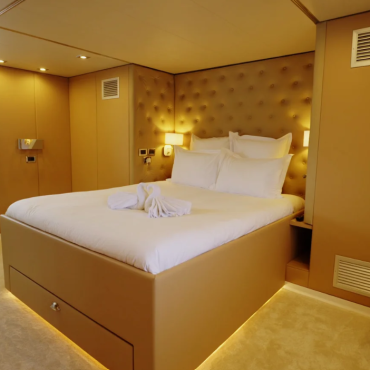 The yacht accommodates up to 12 guests overnight across 5 spacious cabins, and 12 guests for cruising. The cabin layout includes a Master suite, two VIP cabins, one Twin, one Mini-Double, and a convertible salon. While docked, she can host up to 70 guests, making her an excellent choice for exclusive events and celebrations.
