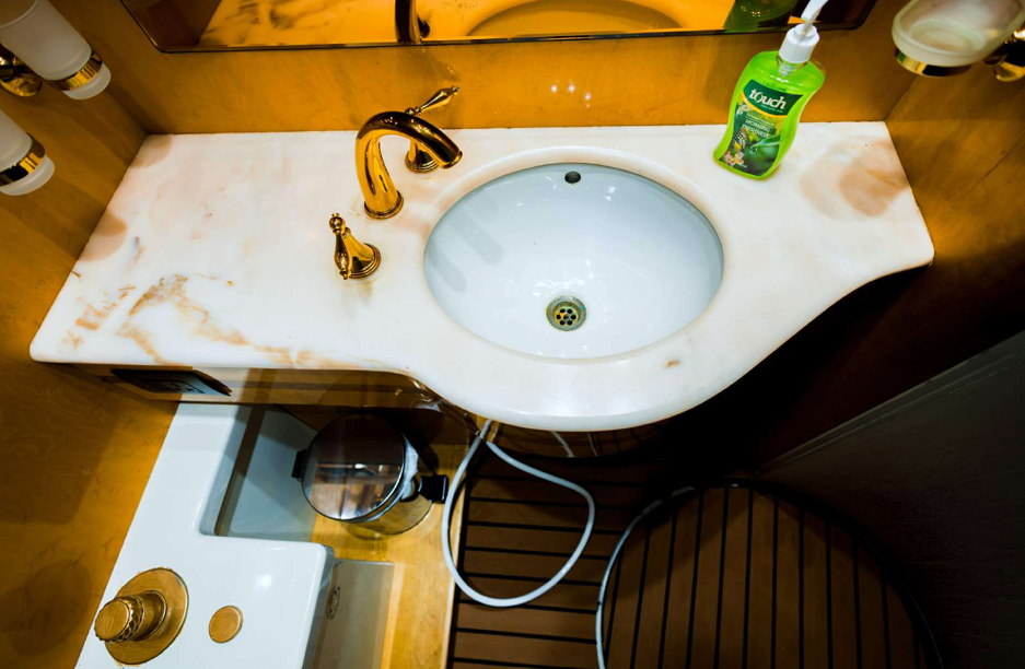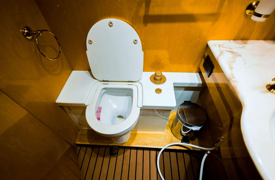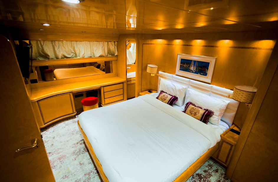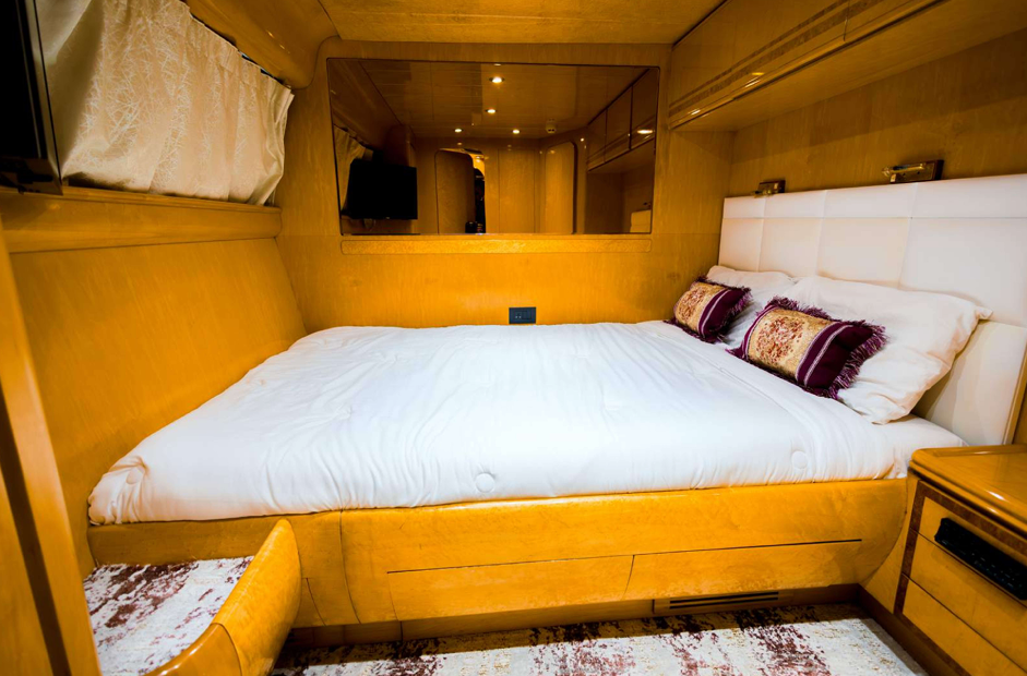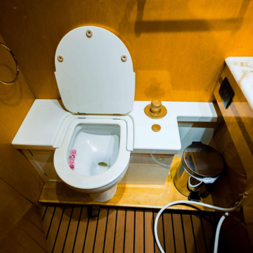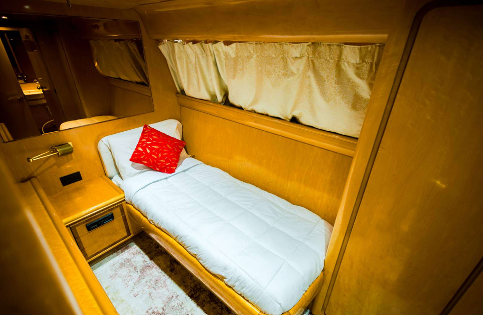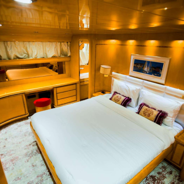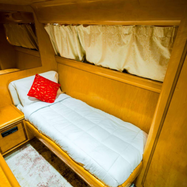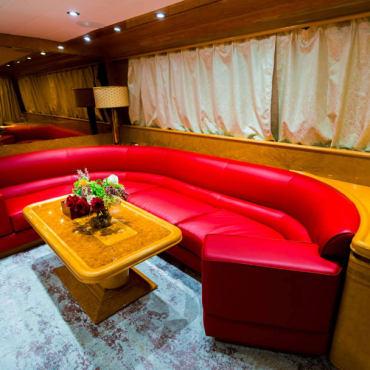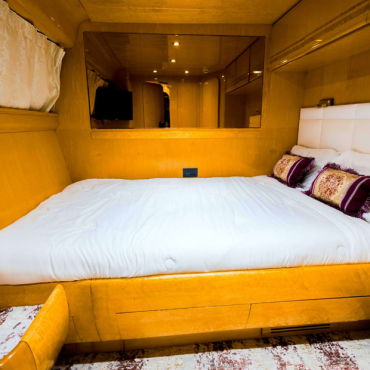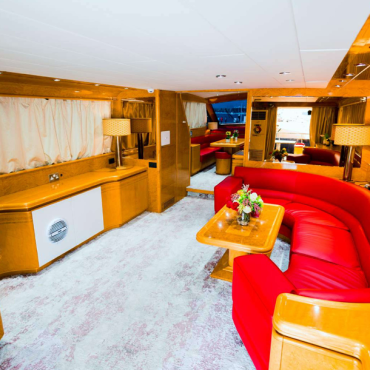 The yacht’s large flybridge offers panoramic views and includes plush seating, a sunbathing area, and an alfresco dining space—perfect for sunset dinners or socializing with friends. The main deck also features a spacious salon and entertainment system for a seamless indoor-outdoor experience.