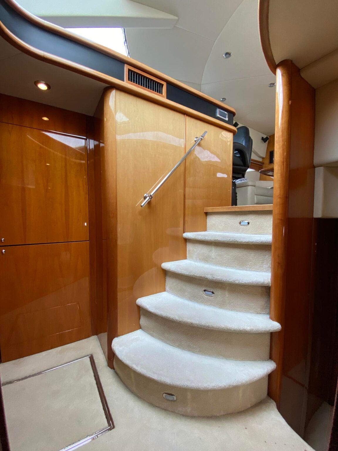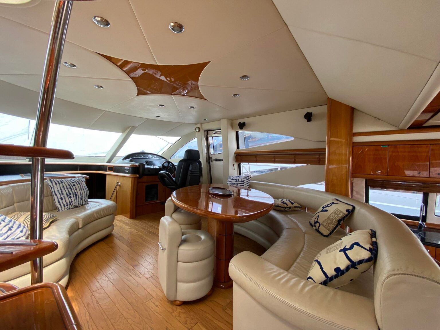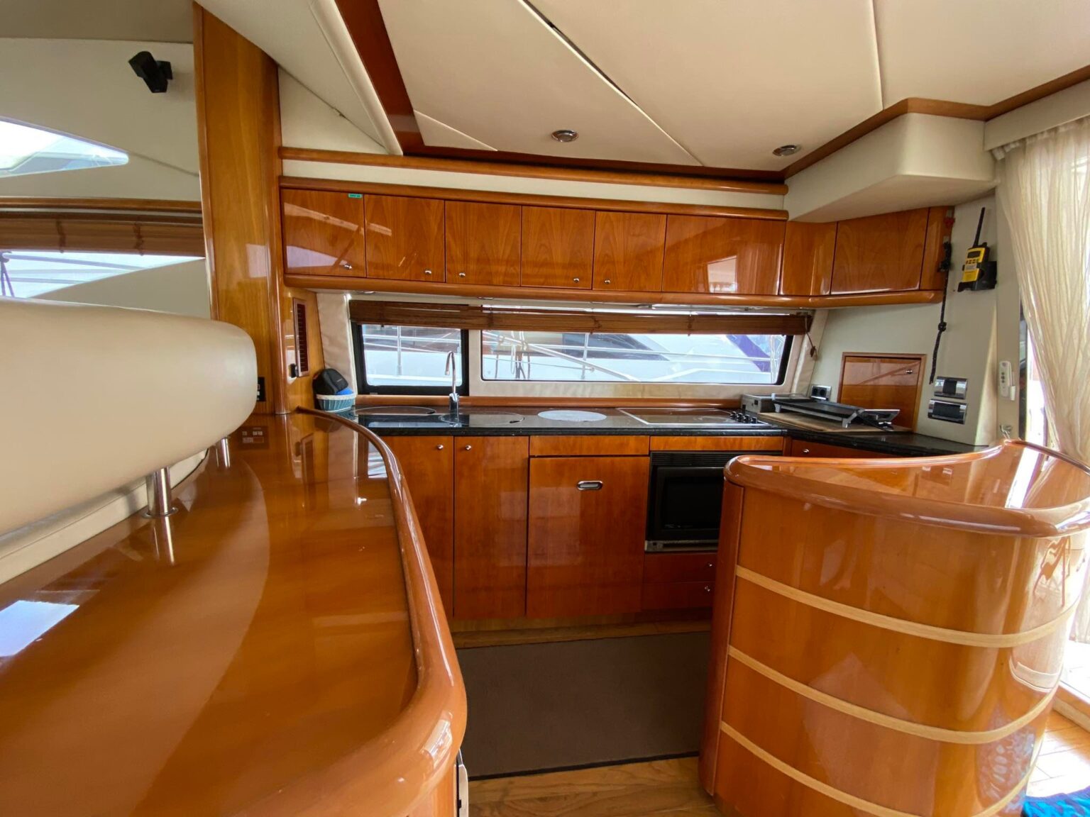 The impressive flybridge offers generous seating areas accessible from both the saloon and the aft cockpit. Inside, the spacious upper saloon is complemented by a second lounge aft with a fully equipped galley, including an oven, microwave, refrigerator, ice maker, grill, and more.