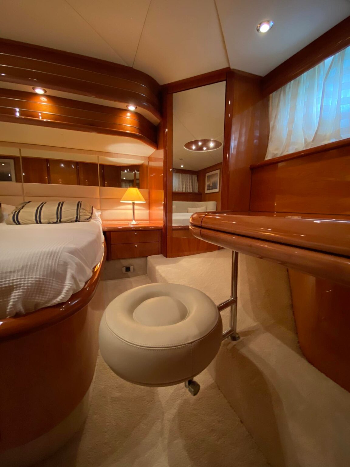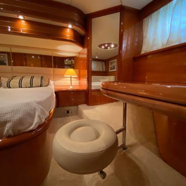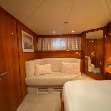 The yacht can comfortably accommodate up to 12 guests for day cruising (excluding crew) and up to 8 guests overnight. The full-width owner’s stateroom and two additional cabins ensure comfort and privacy, all equipped with air conditioning for warm summer days.