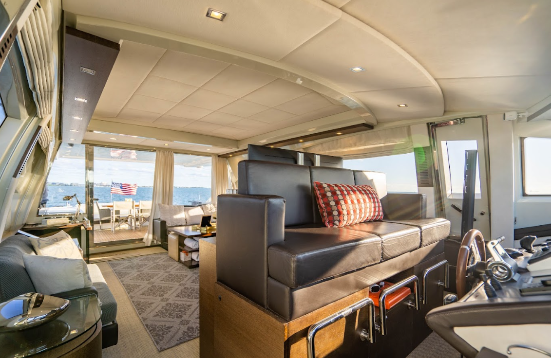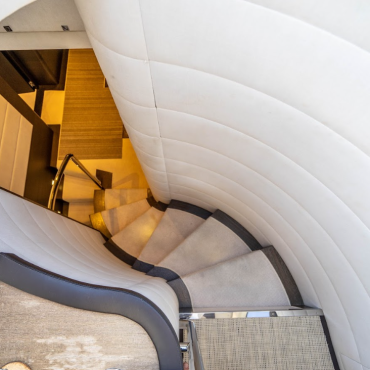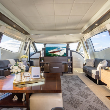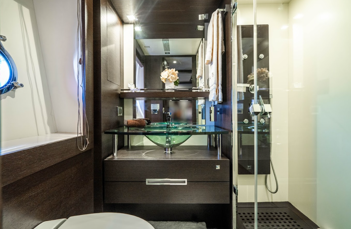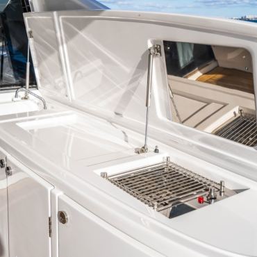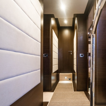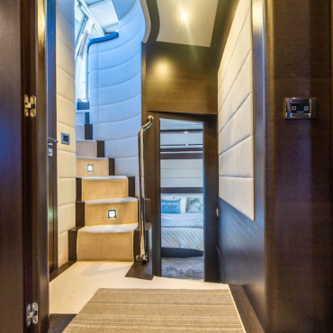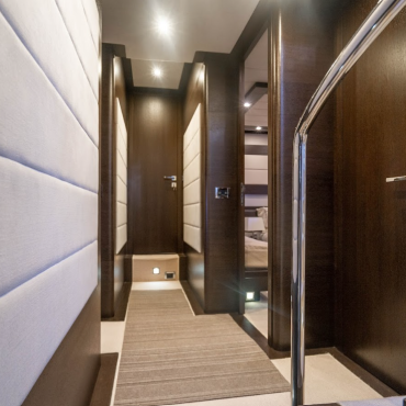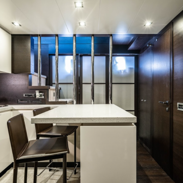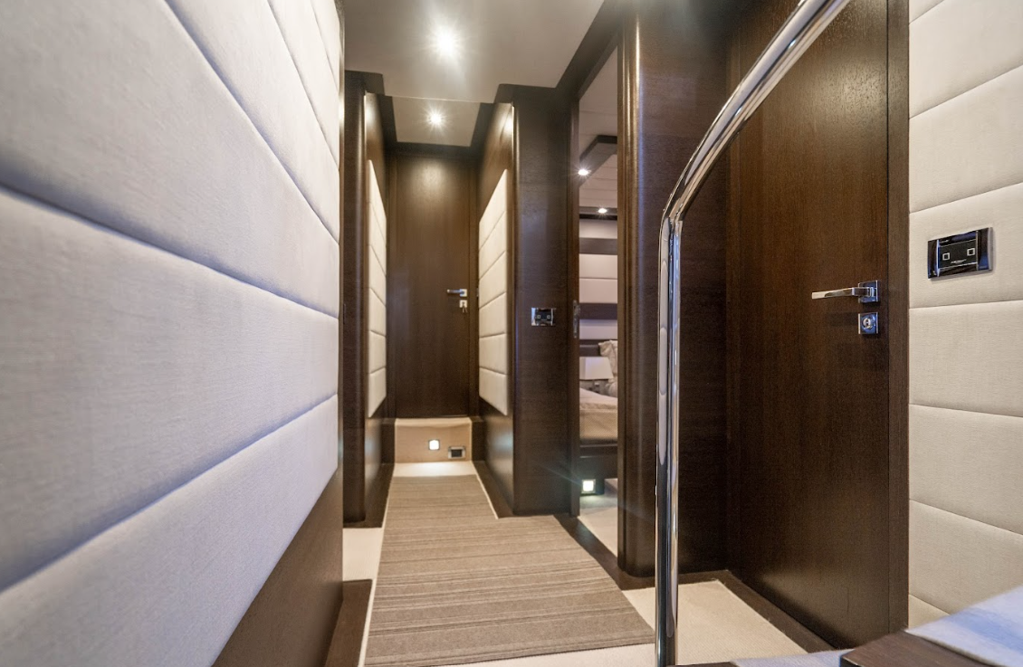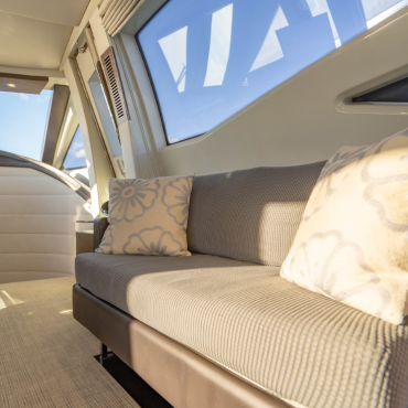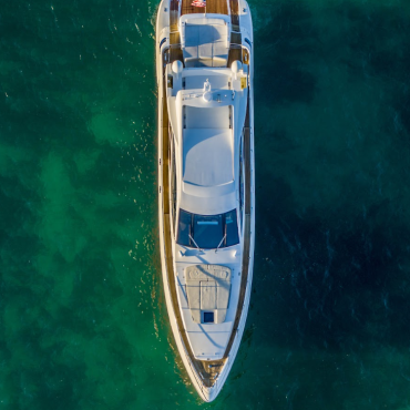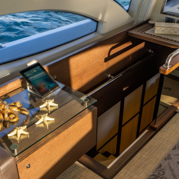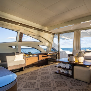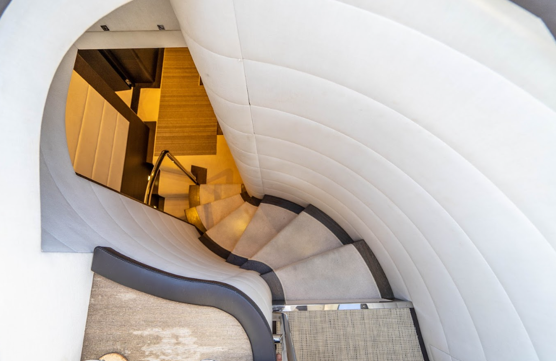 With an aggressive, unmistakable profile, the yacht is instantly recognizable by its sporty hull and six central square windows — a signature design element of the Open line. The superstructure features distinctive shark-fin-shaped windows, with an additional elongated pane for enhanced visibility and a streamlined look.