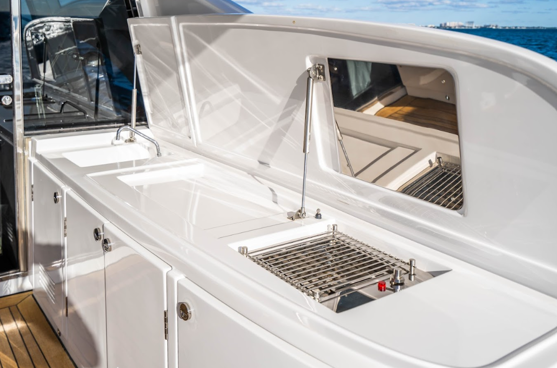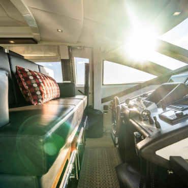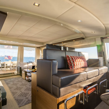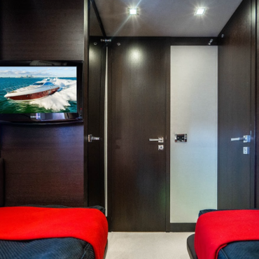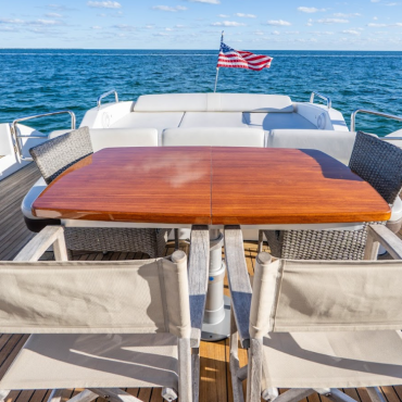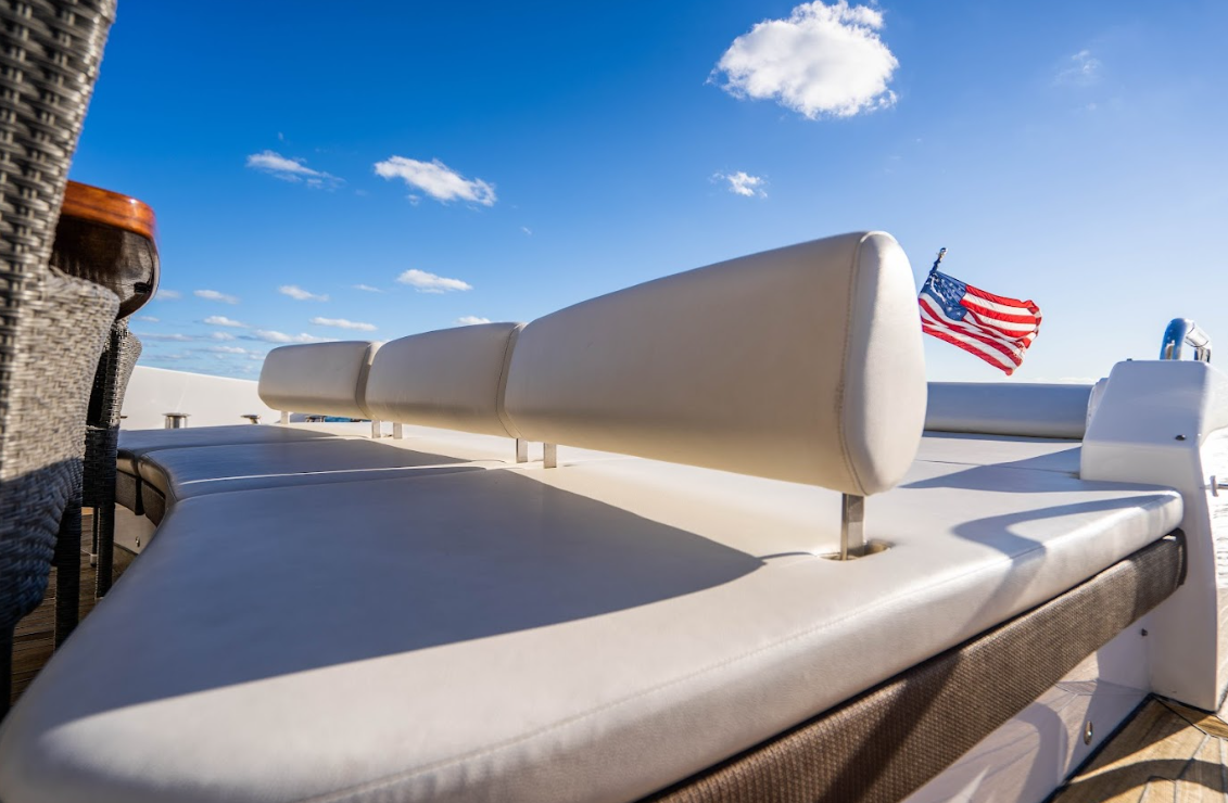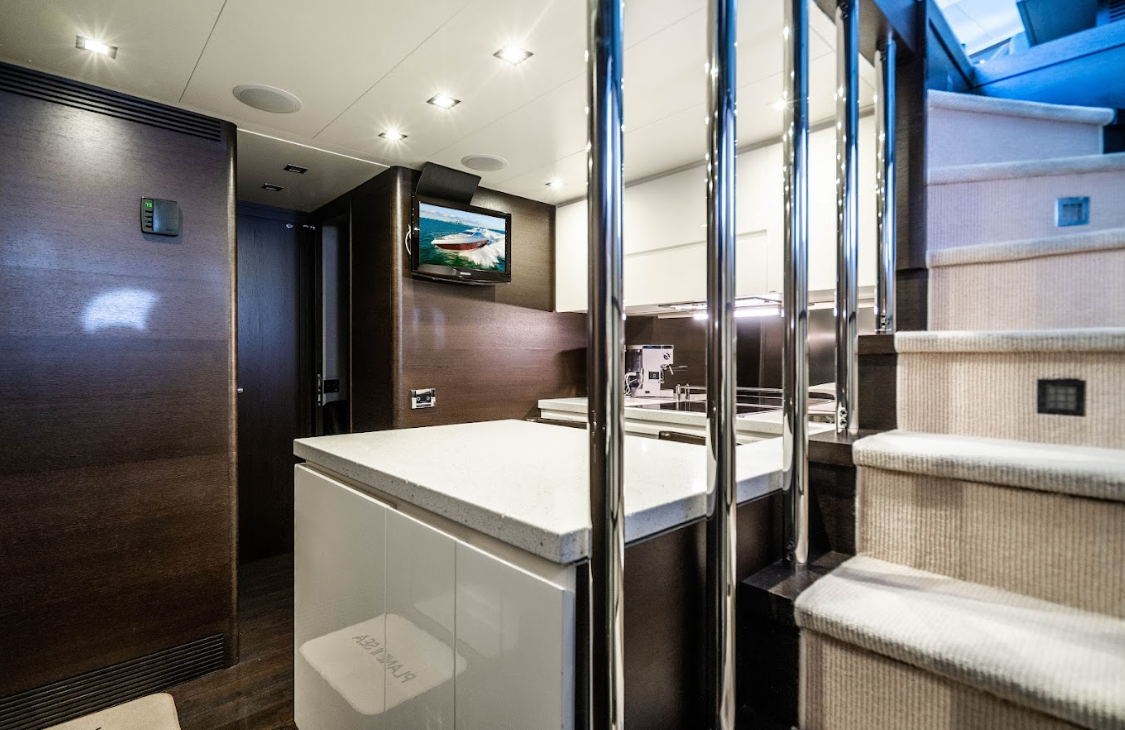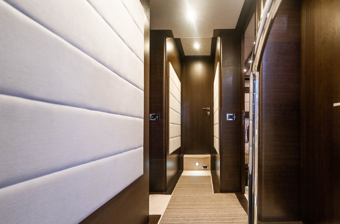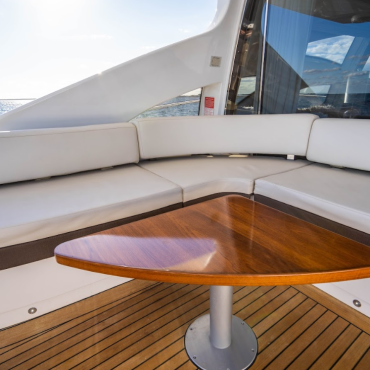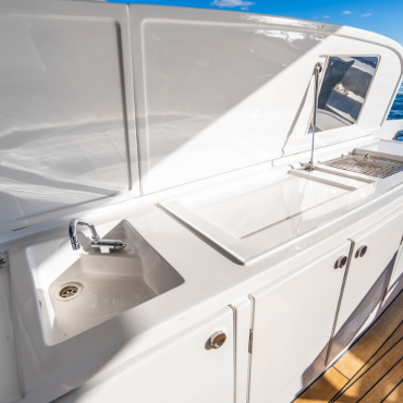 With an aggressive, unmistakable profile, the yacht is instantly recognizable by its sporty hull and six central square windows — a signature design element of the Open line. The superstructure features distinctive shark-fin-shaped windows, with an additional elongated pane for enhanced visibility and a streamlined look.