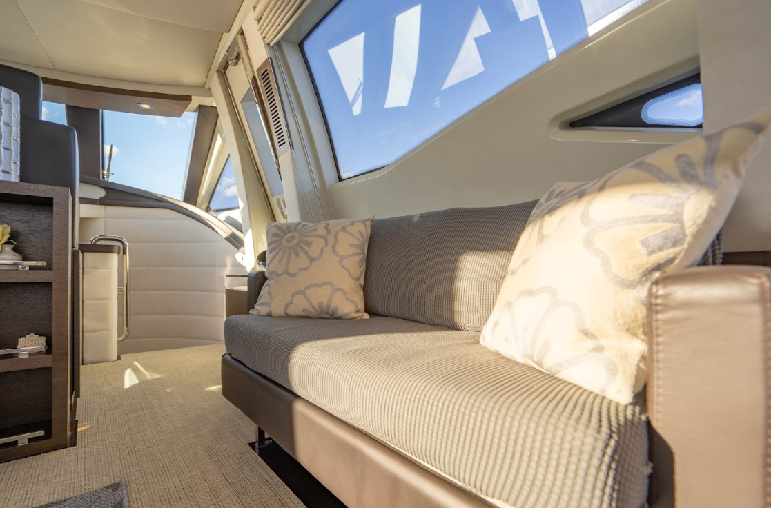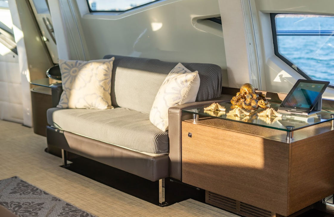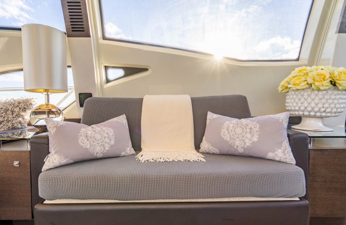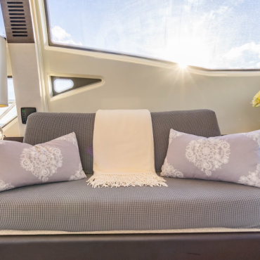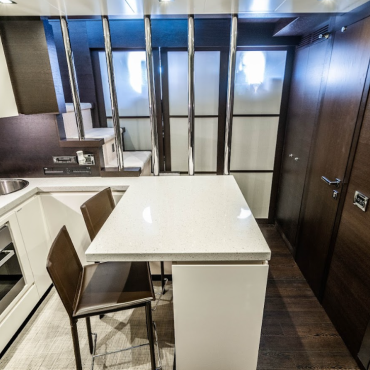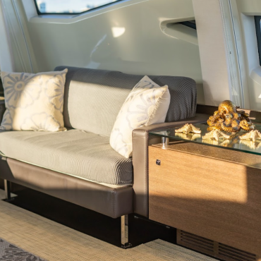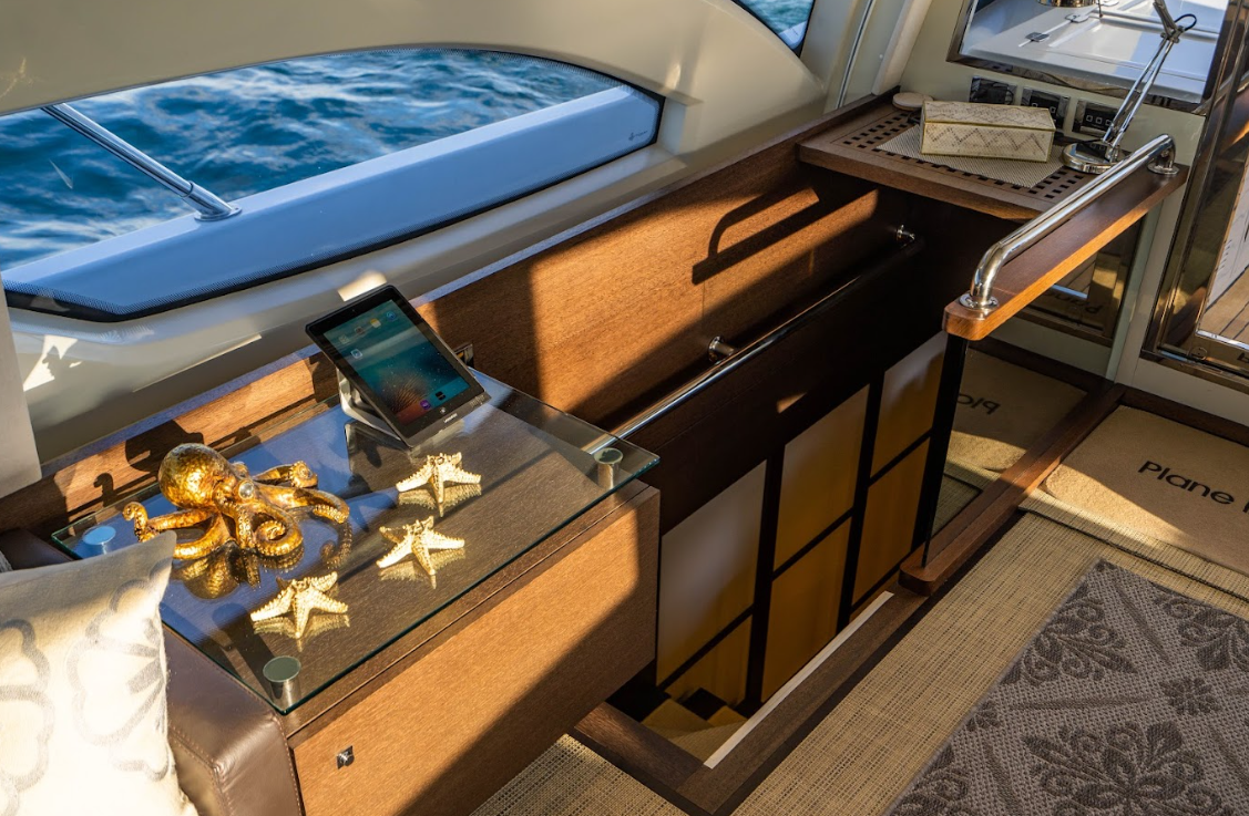 The salon can be completely opened to the aft cockpit or sealed off for privacy, thanks to a large sliding glass door.