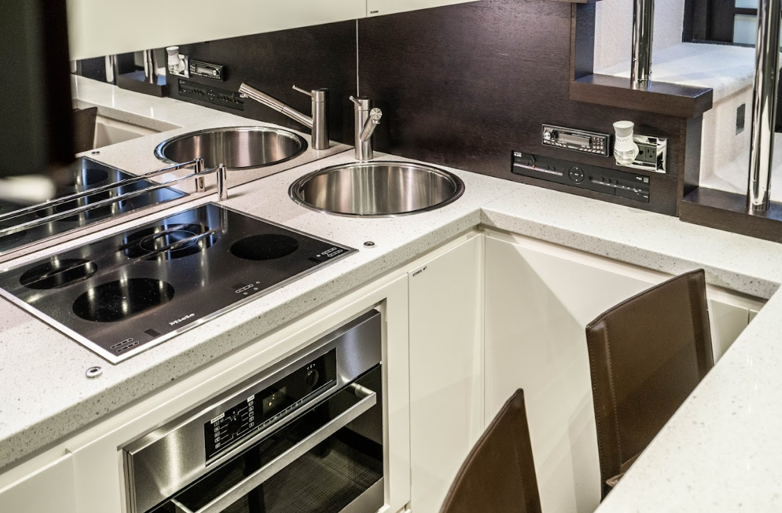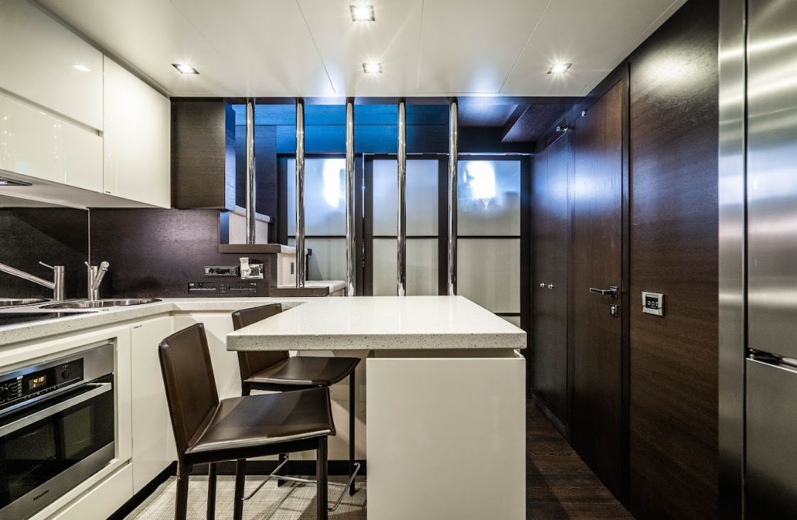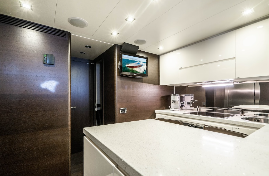 The galley is located on the lower deck and is currently non-functional, requiring refurbishment.