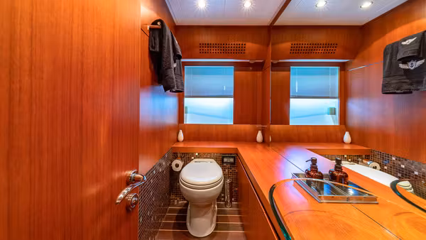 Equipped with modern amenities such as a premium sound system, plasma TV, and water toys including a tender and waterskis, the yacht ensures both relaxation and adventure. Guests can enjoy a range of water sports, making it perfect for those seeking an active day on the water.