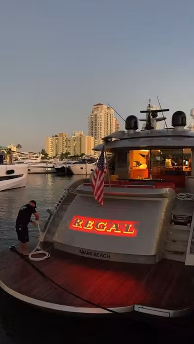 Step aboard the stunning 90′ Pershing Yacht “Regal”, the epitome of style and luxury for your Miami yacht charter. With its sleek low profile, curvy lines, and striking stealth coloring, this yacht offers an unmatched visual appeal.