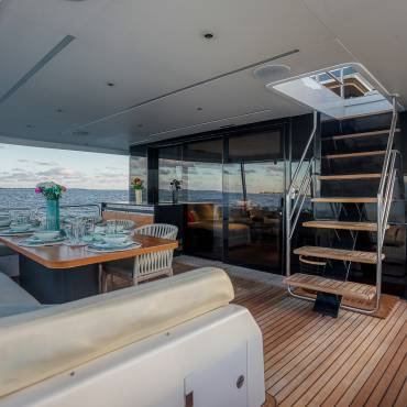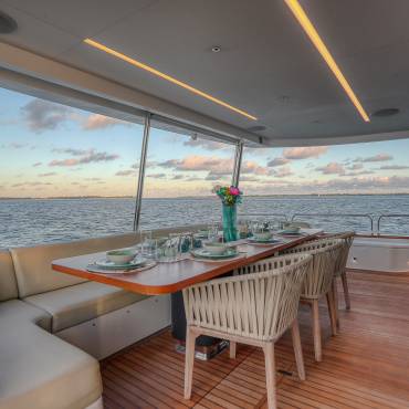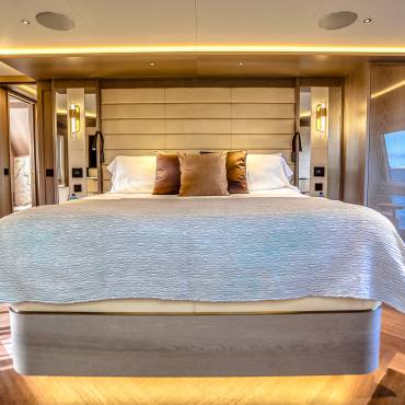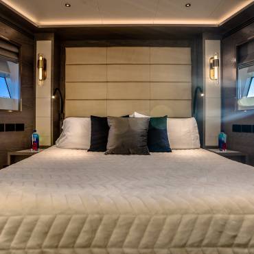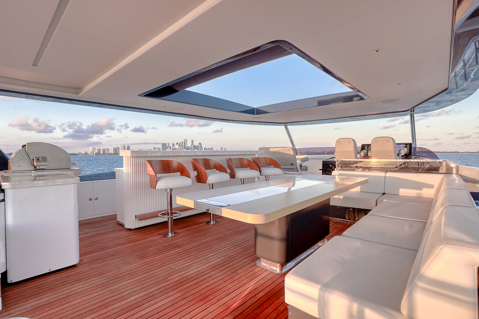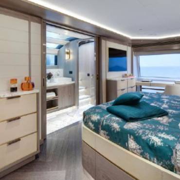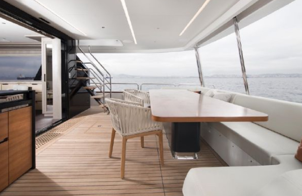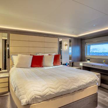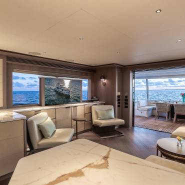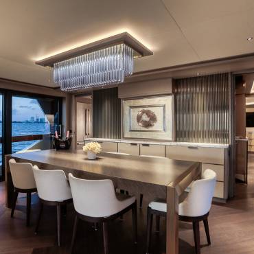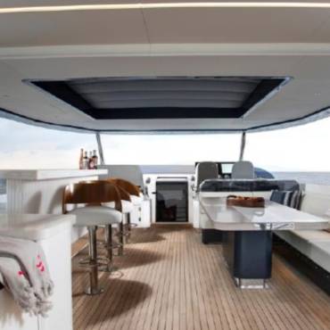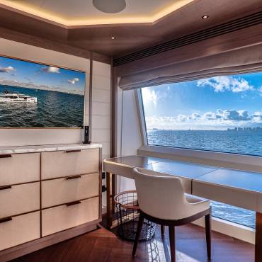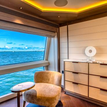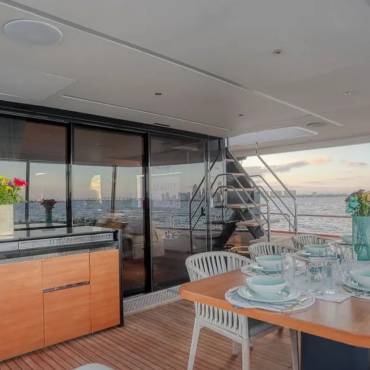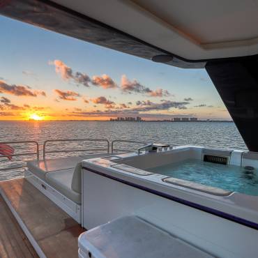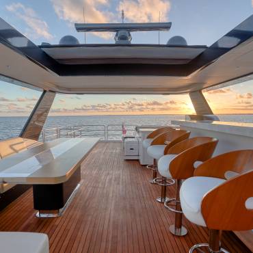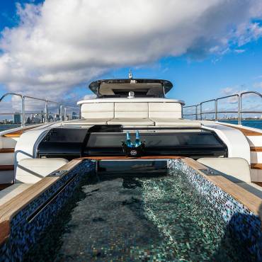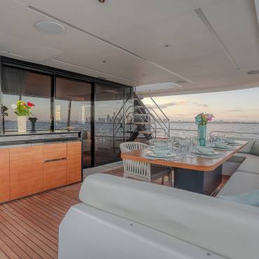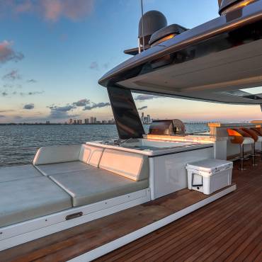 The Sirena 88 impresses from the moment you step on board. Its spacious multi-deck layout provides ample areas for both relaxation and entertainment, from the sun-soaked flybridge to the elegant main salon. The expansive flybridgefeatures a jacuzzi, sun loungers, alfresco dining area, and bar setup, creating the perfect atmosphere for soaking in the Miami skyline or enjoying sunset cocktails.