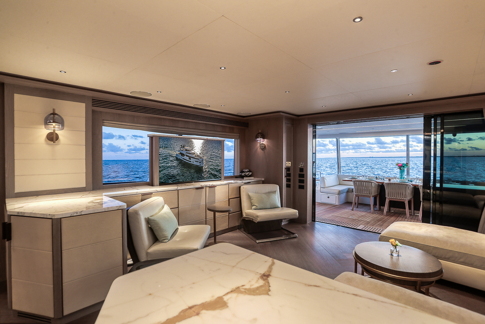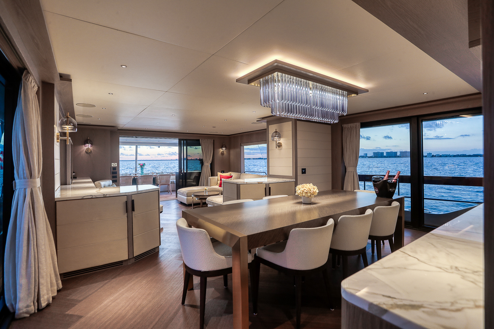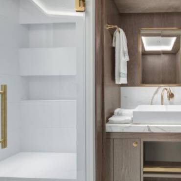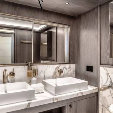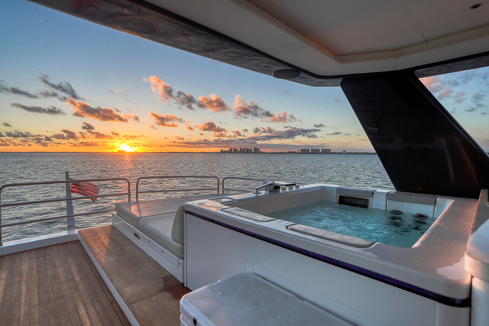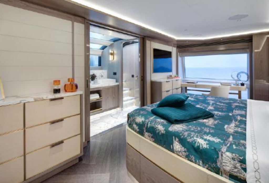 The Sirena 88 impresses from the moment you step on board. Its spacious multi-deck layout provides ample areas for both relaxation and entertainment, from the sun-soaked flybridge to the elegant main salon. The expansive flybridgefeatures a jacuzzi, sun loungers, alfresco dining area, and bar setup, creating the perfect atmosphere for soaking in the Miami skyline or enjoying sunset cocktails.