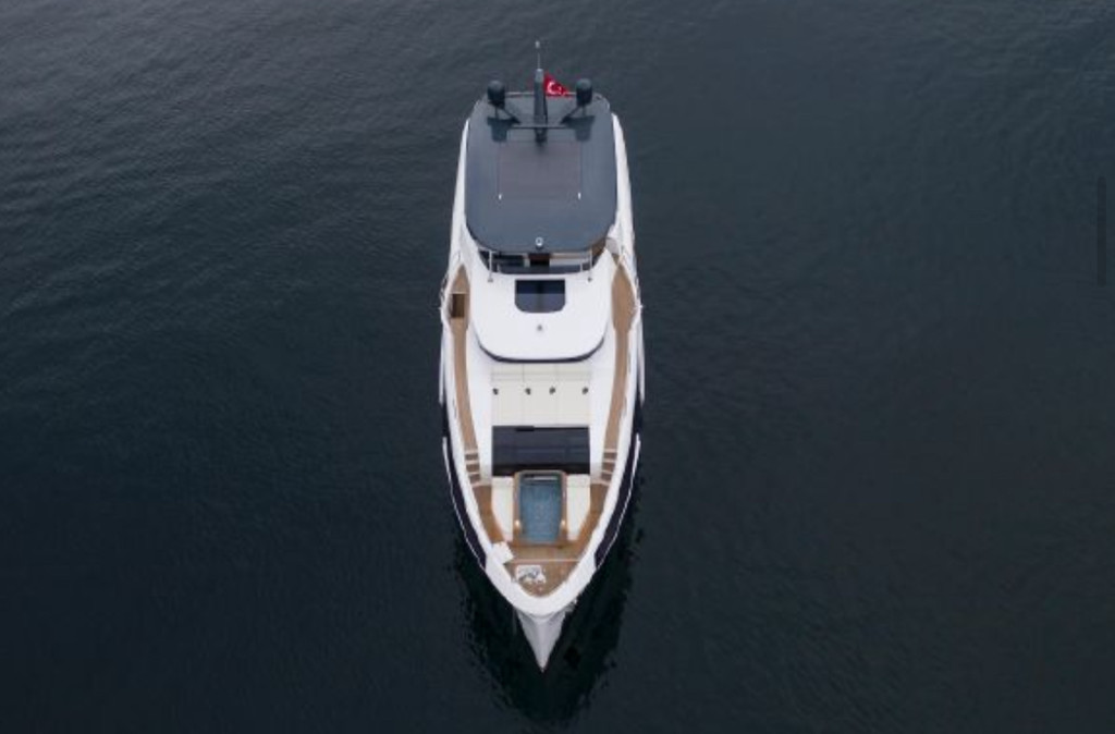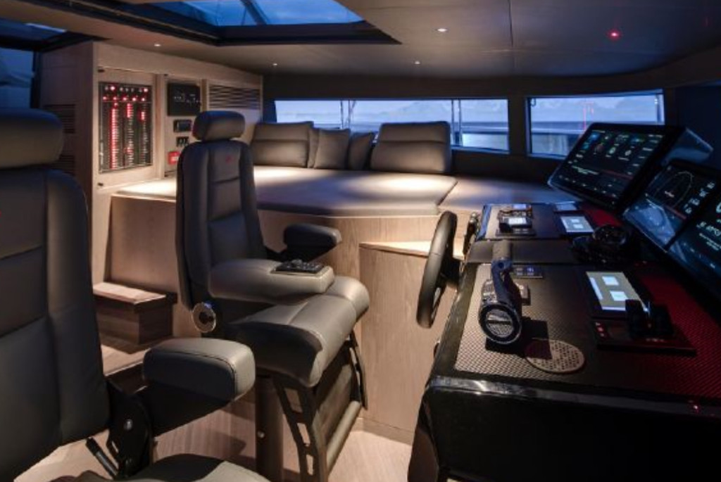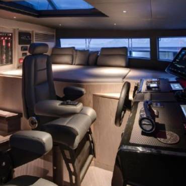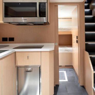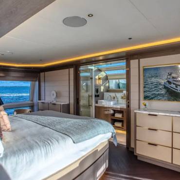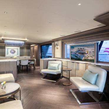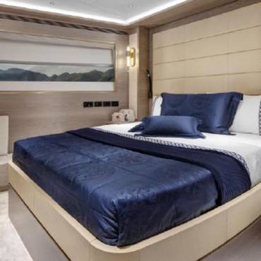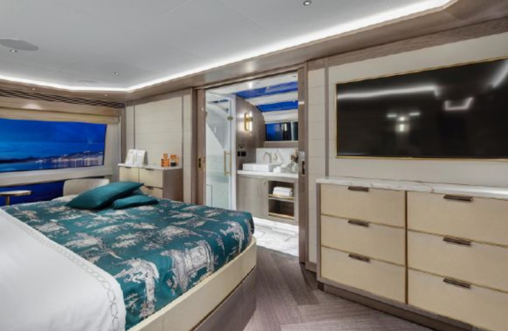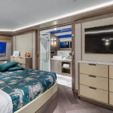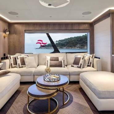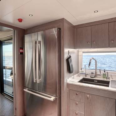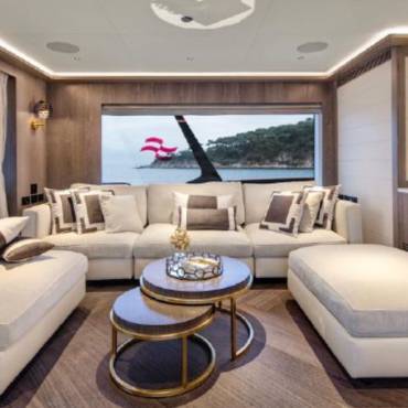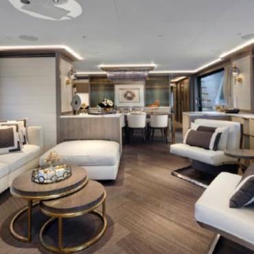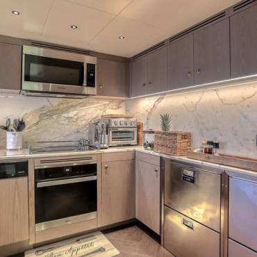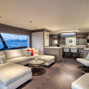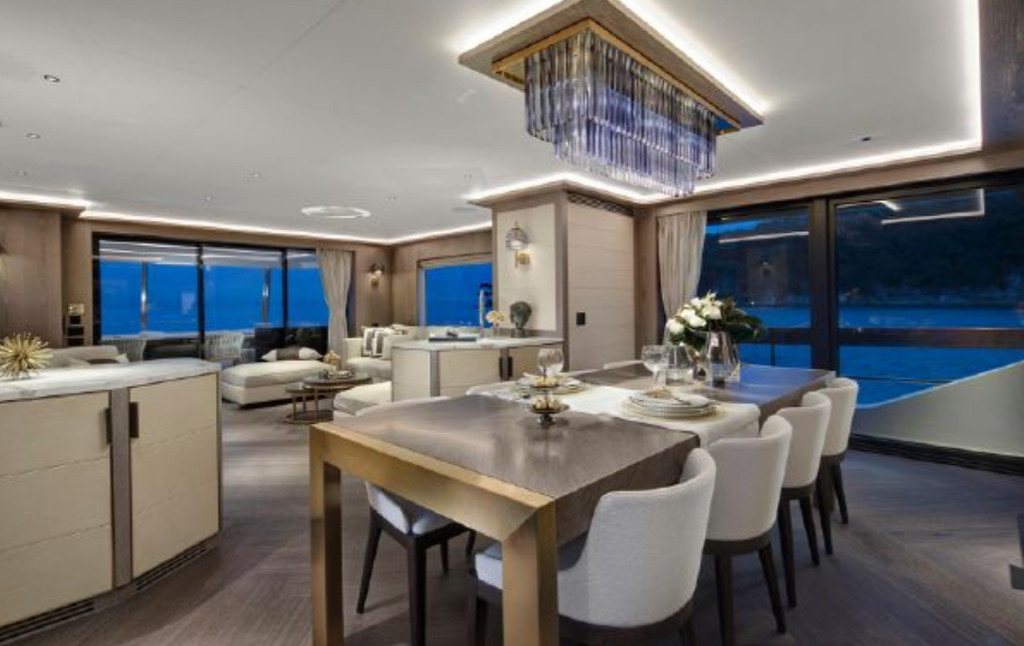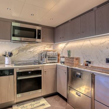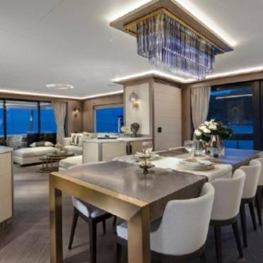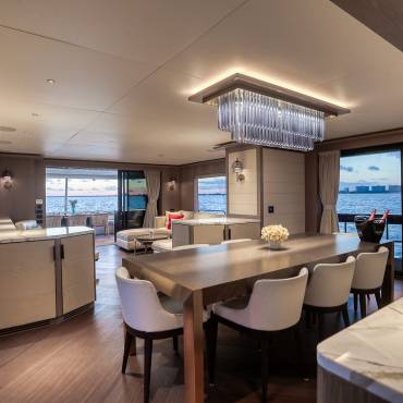 Inside, the yacht’s interior design blends modern luxury with comfort, featuring panoramic windows, rich furnishings, and an open-concept salon with plush seating and a state-of-the-art entertainment system. The gourmet kitchen (galley) comes fully equipped for onboard dining experiences curated by a private chef.