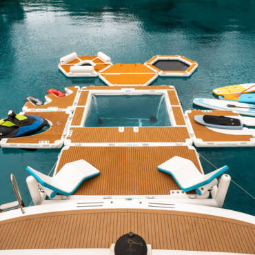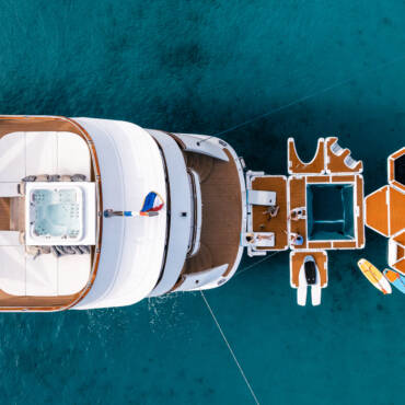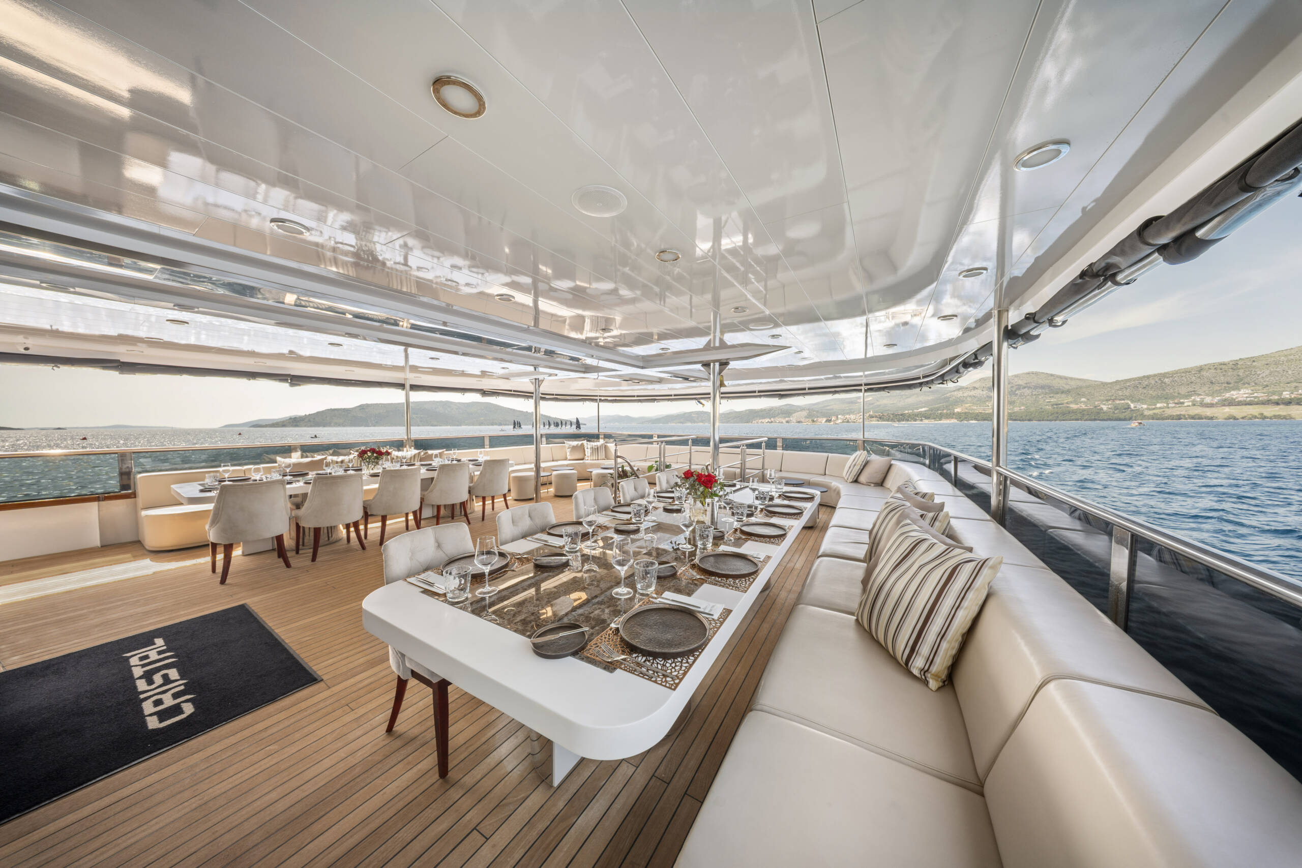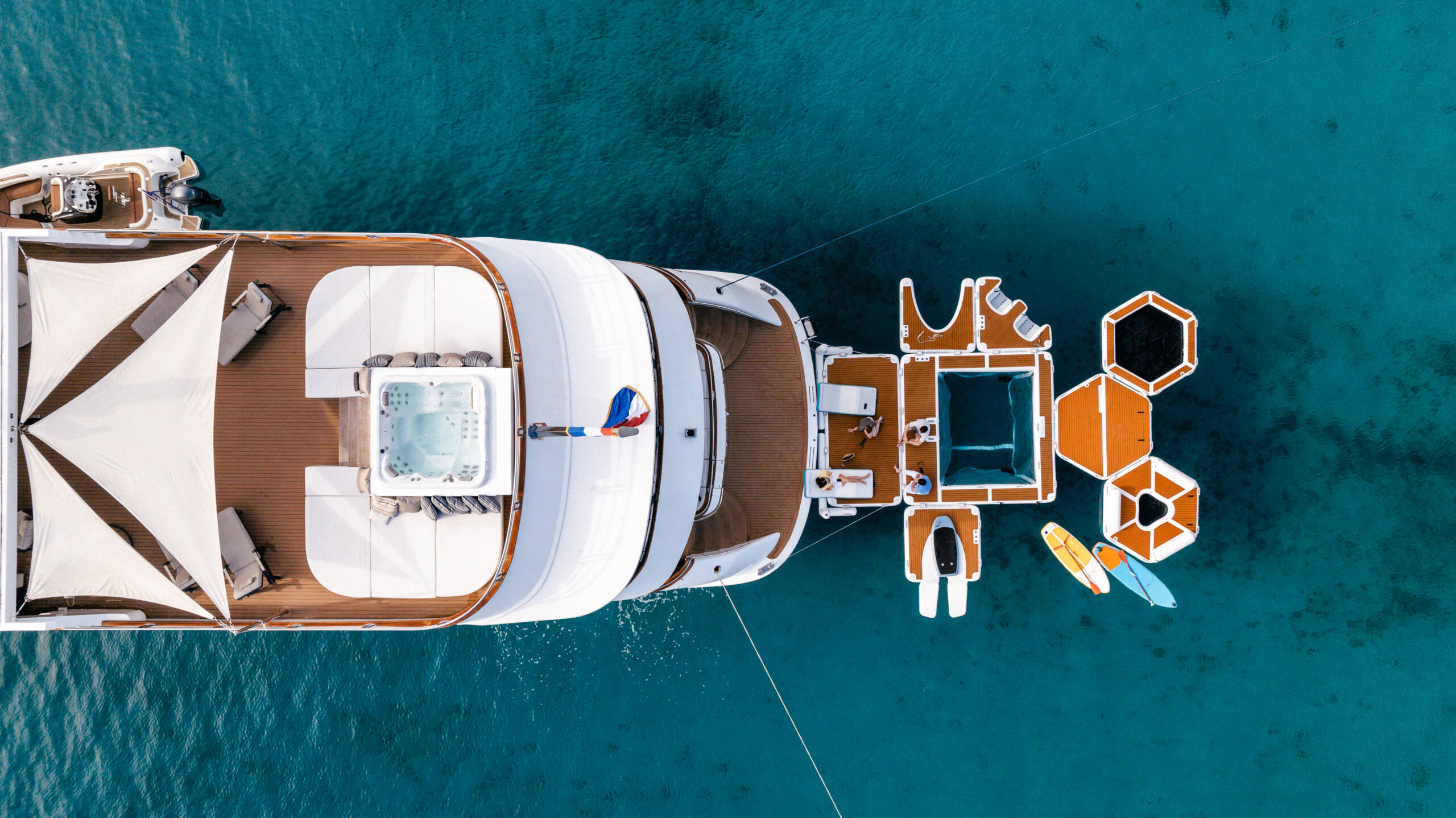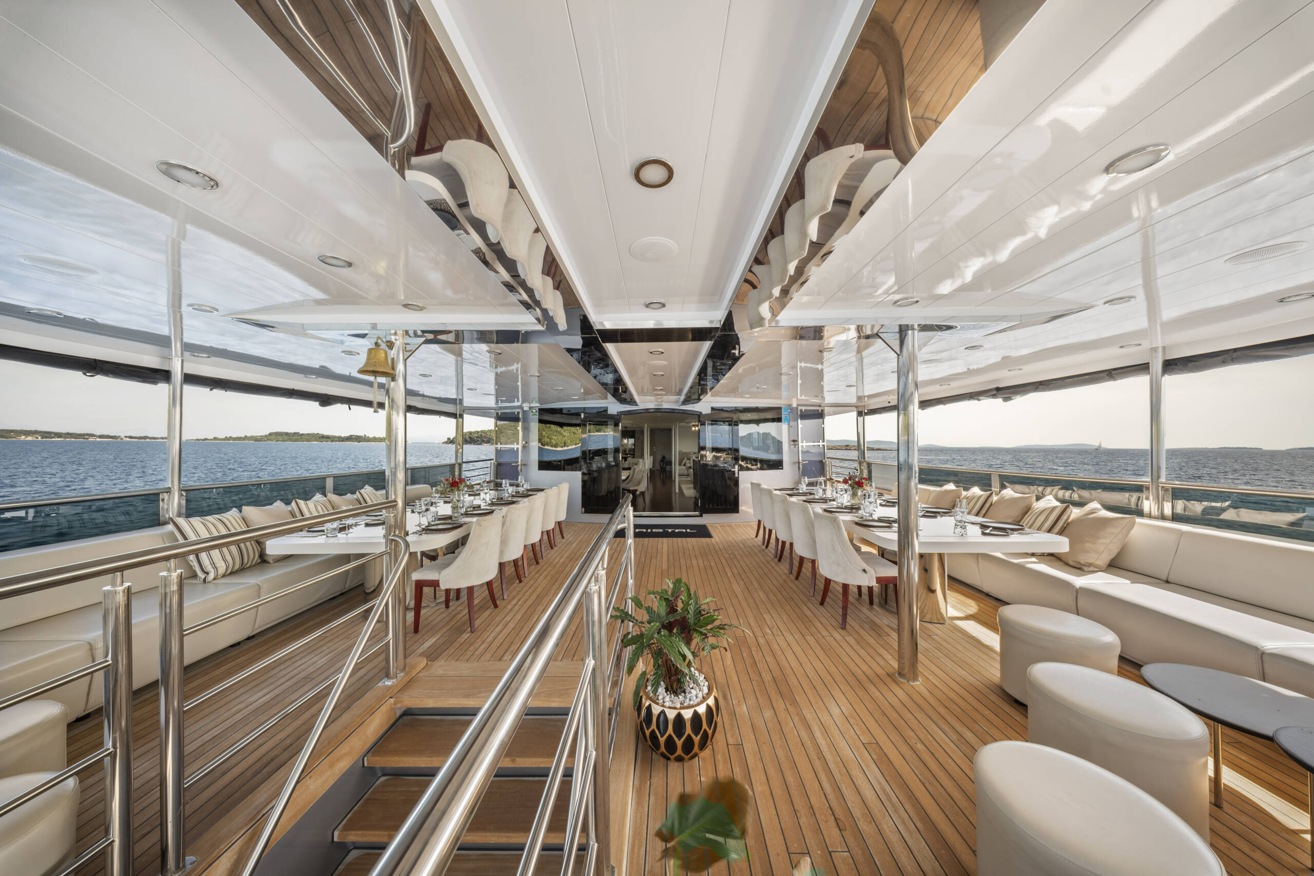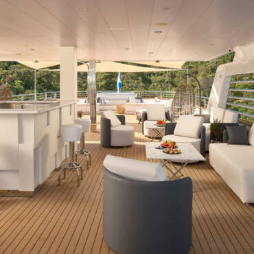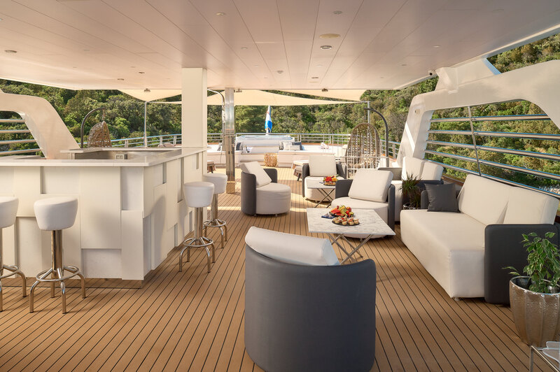 The expansive sundeck is the heart of onboard living — perfect for gatherings under the sun and stars. Guests enjoy: