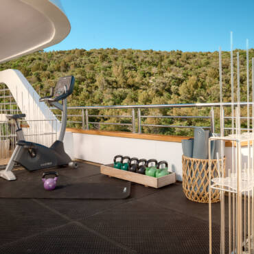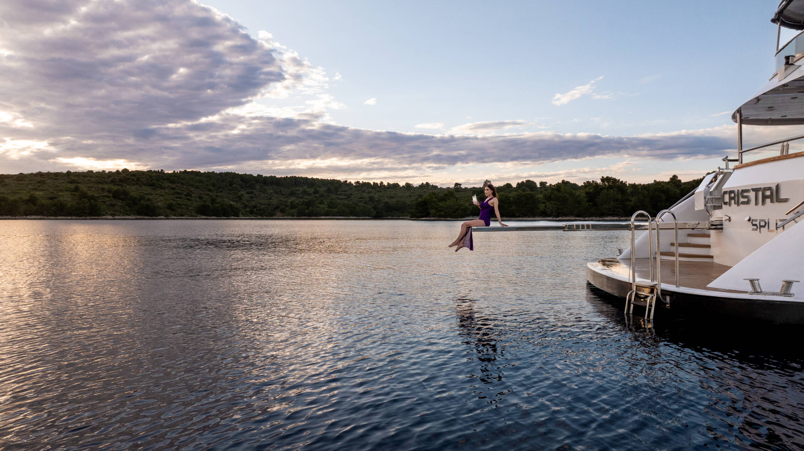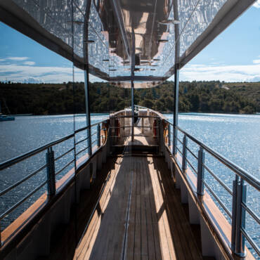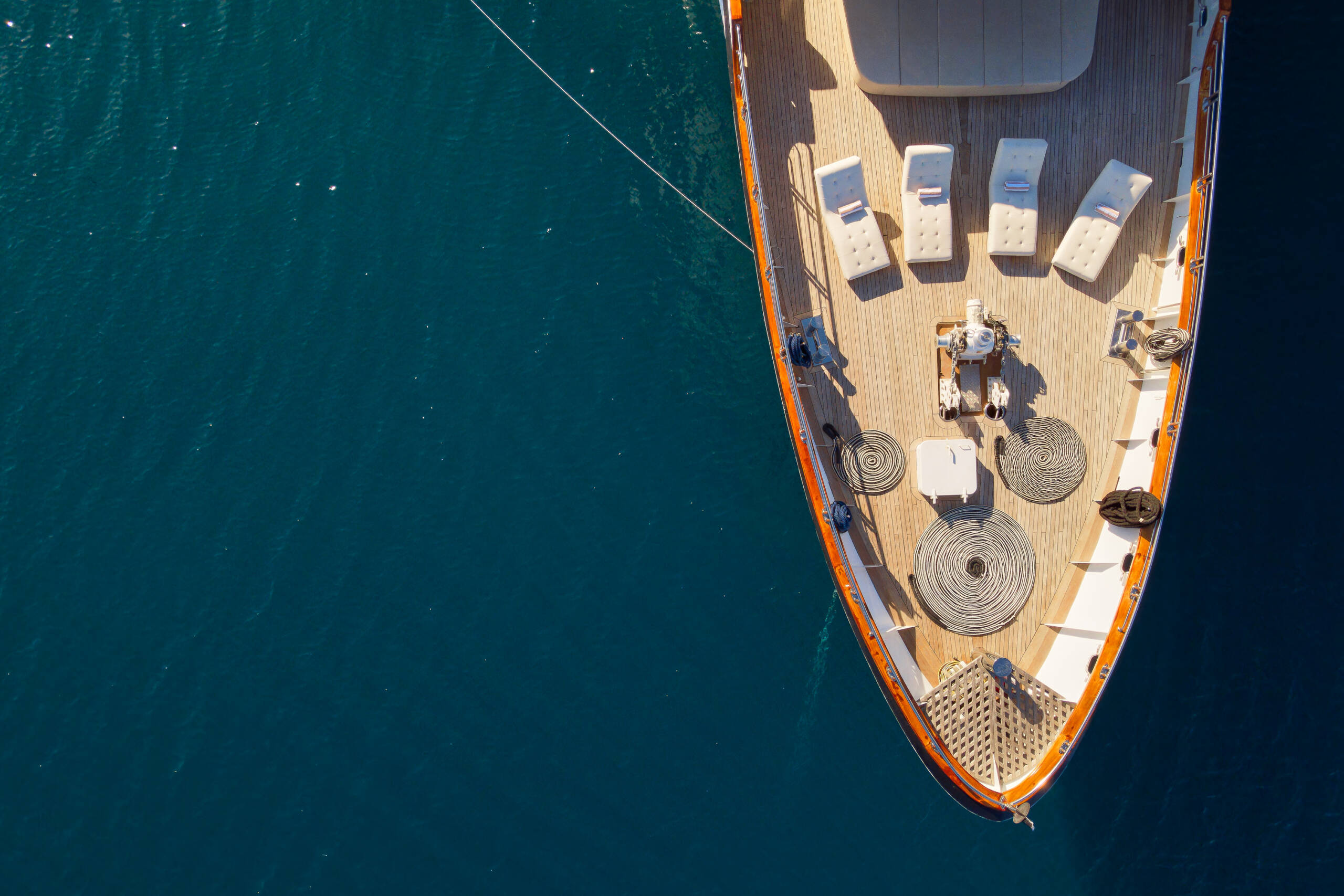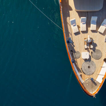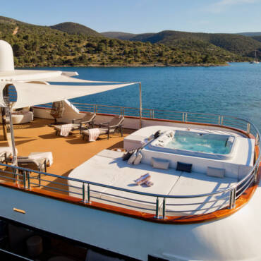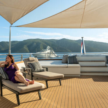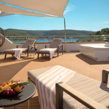 The forward deck features four elegant ivory chaise lounges — the ideal setting for sunbathing while surrounded by the natural beauty of the Adriatic coastline.