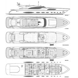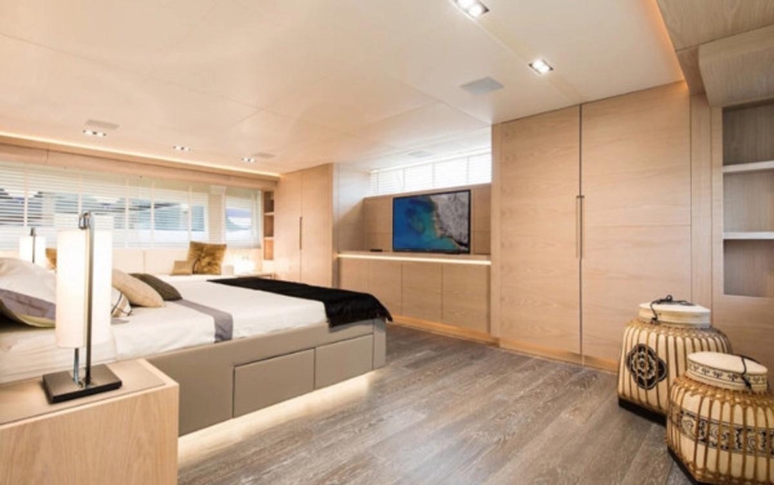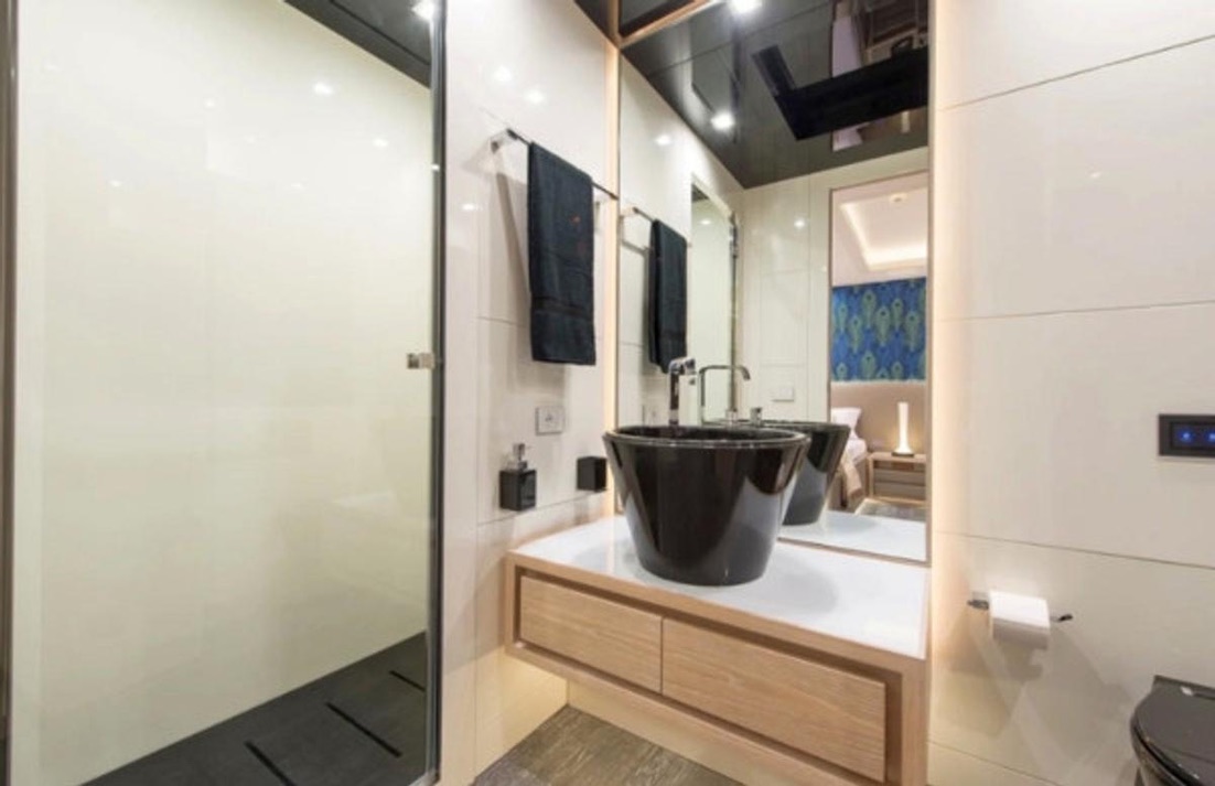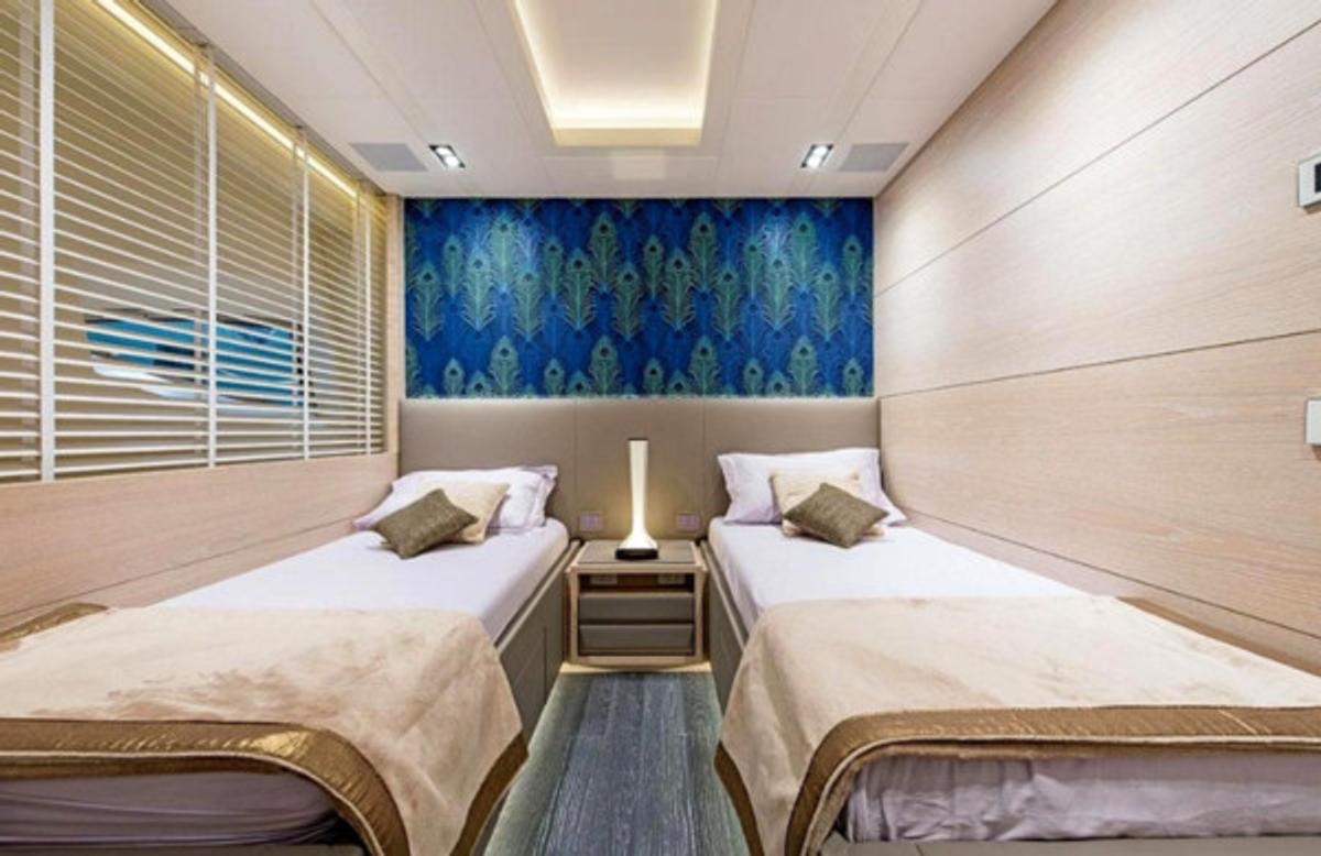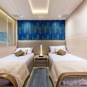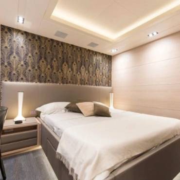 Accommodation – Main deck master suite with king bed, walk-in closet, en-suite, private starboard-side balcony, and direct access to bow – Three VIP cabins with double beds and en-suites – One twin cabin with en-suite – Convertible room used as gym/media room or optional 6th cabin – Crew quarters for 7 in 4 cabins with dedicated mess and laundry area