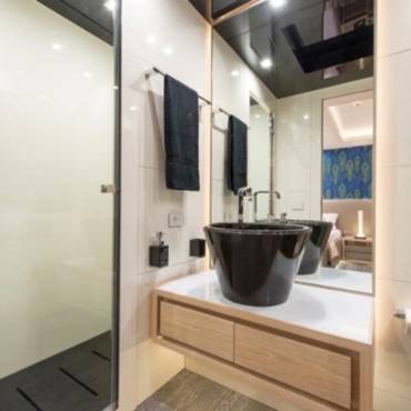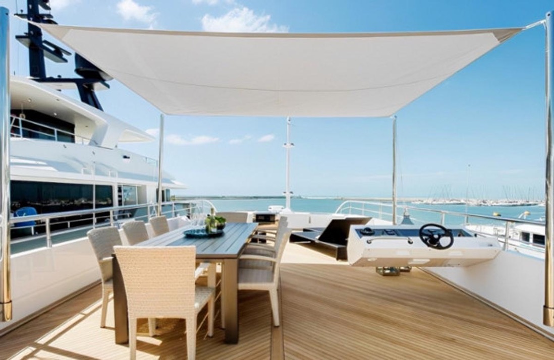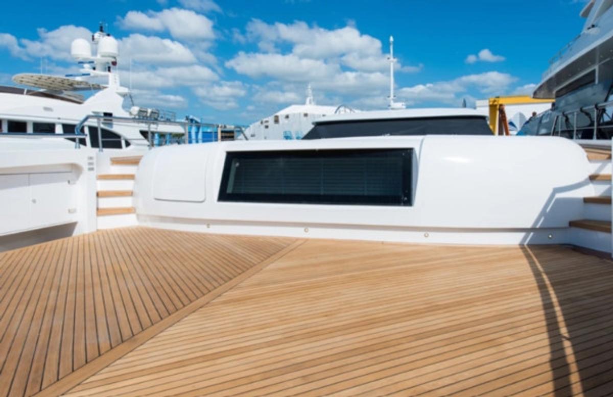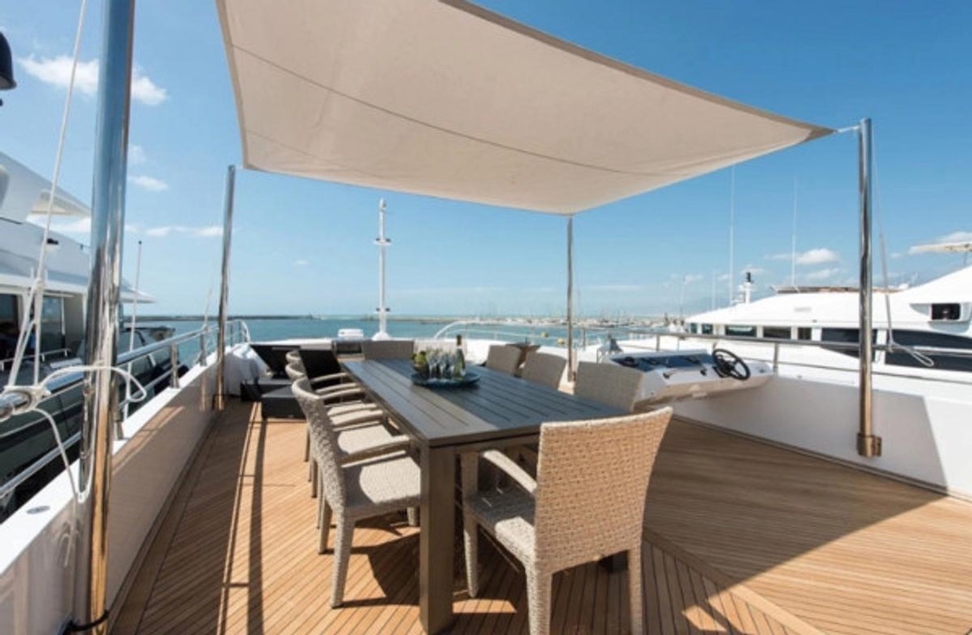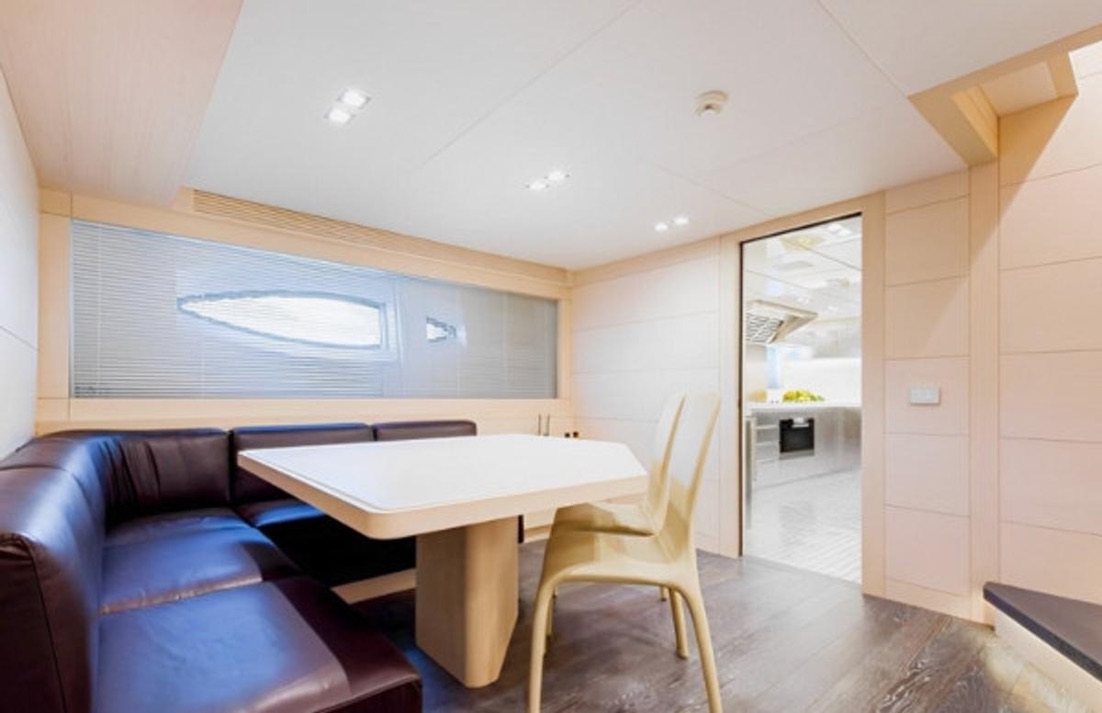 Accommodation – Main deck master suite with king bed, walk-in closet, en-suite, private starboard-side balcony, and direct access to bow – Three VIP cabins with double beds and en-suites – One twin cabin with en-suite – Convertible room used as gym/media room or optional 6th cabin – Crew quarters for 7 in 4 cabins with dedicated mess and laundry area