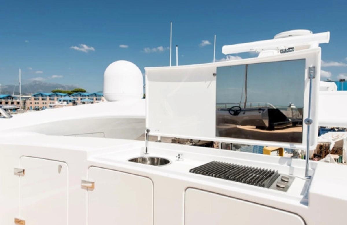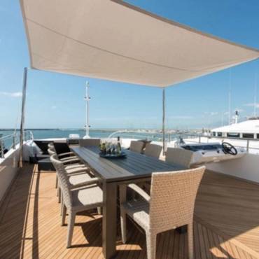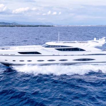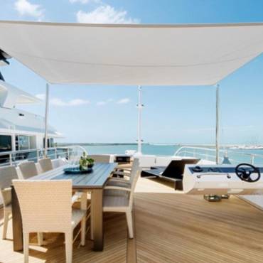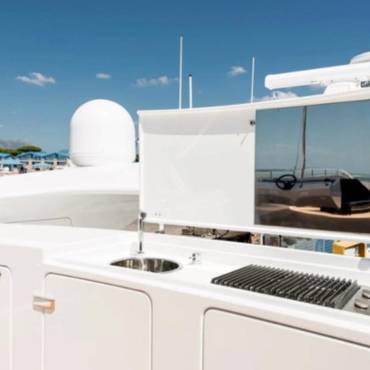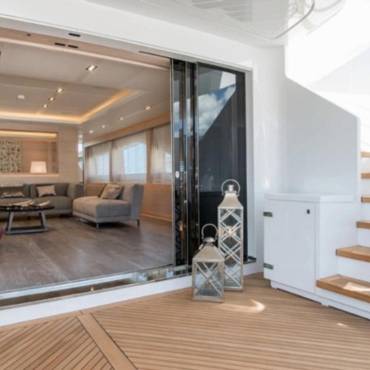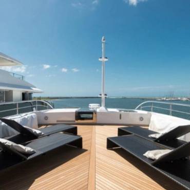 Amenities & Entertainment – Stabilizers (zero-speed and underway) – Full air conditioning – Teak decking throughout – Large sunpads and al-fresco dining – Fully equipped galley and laundry – TV and audio in all cabins and lounge areas – Wi-Fi throughout – Indoor cinema system – Swim platform with garage and underwater lights – Outdoor bar, grill, and lounging area