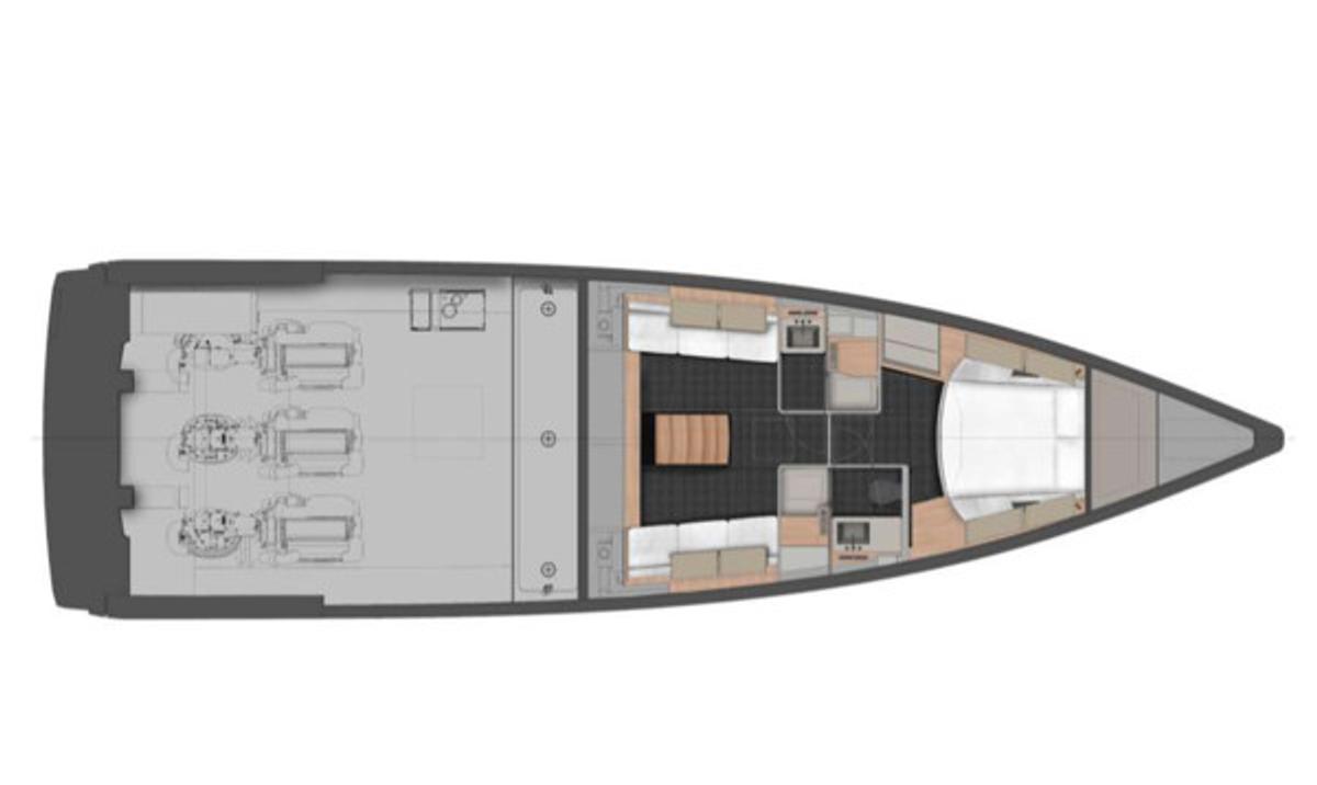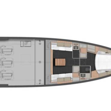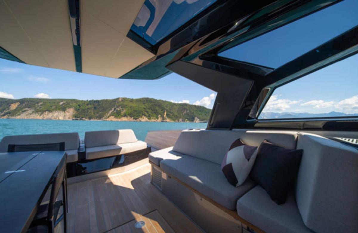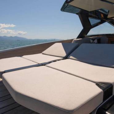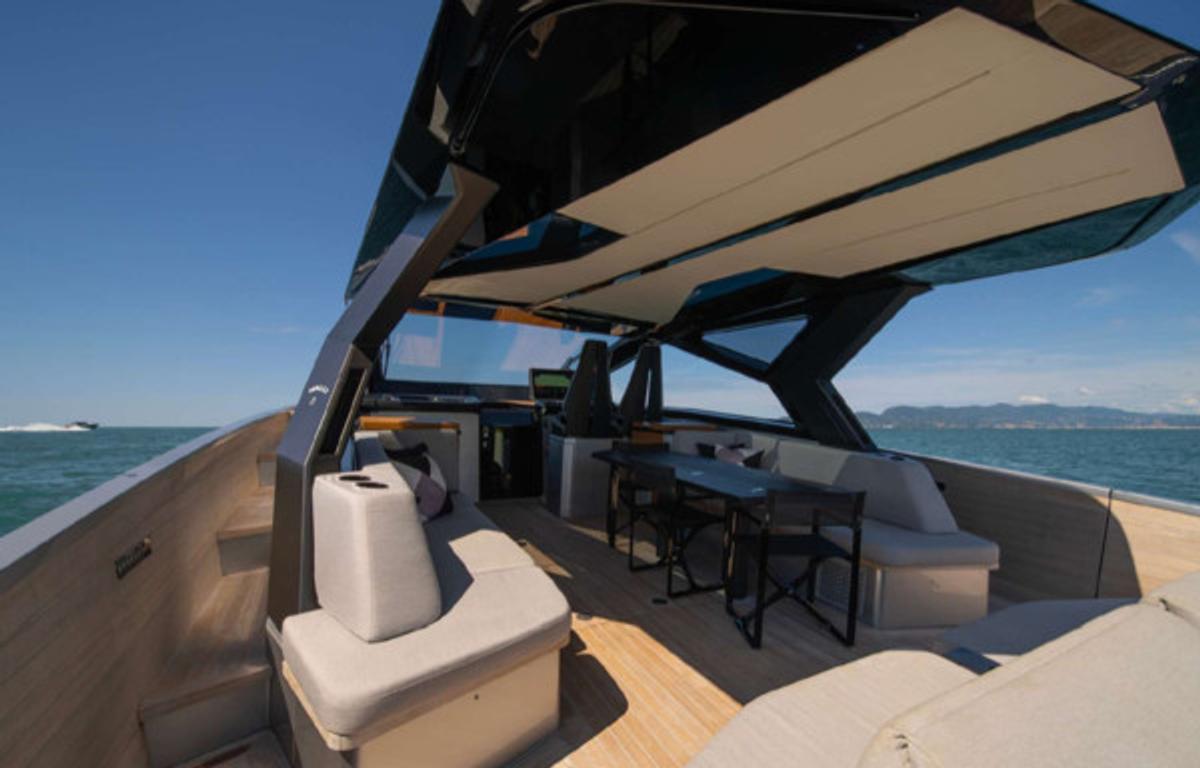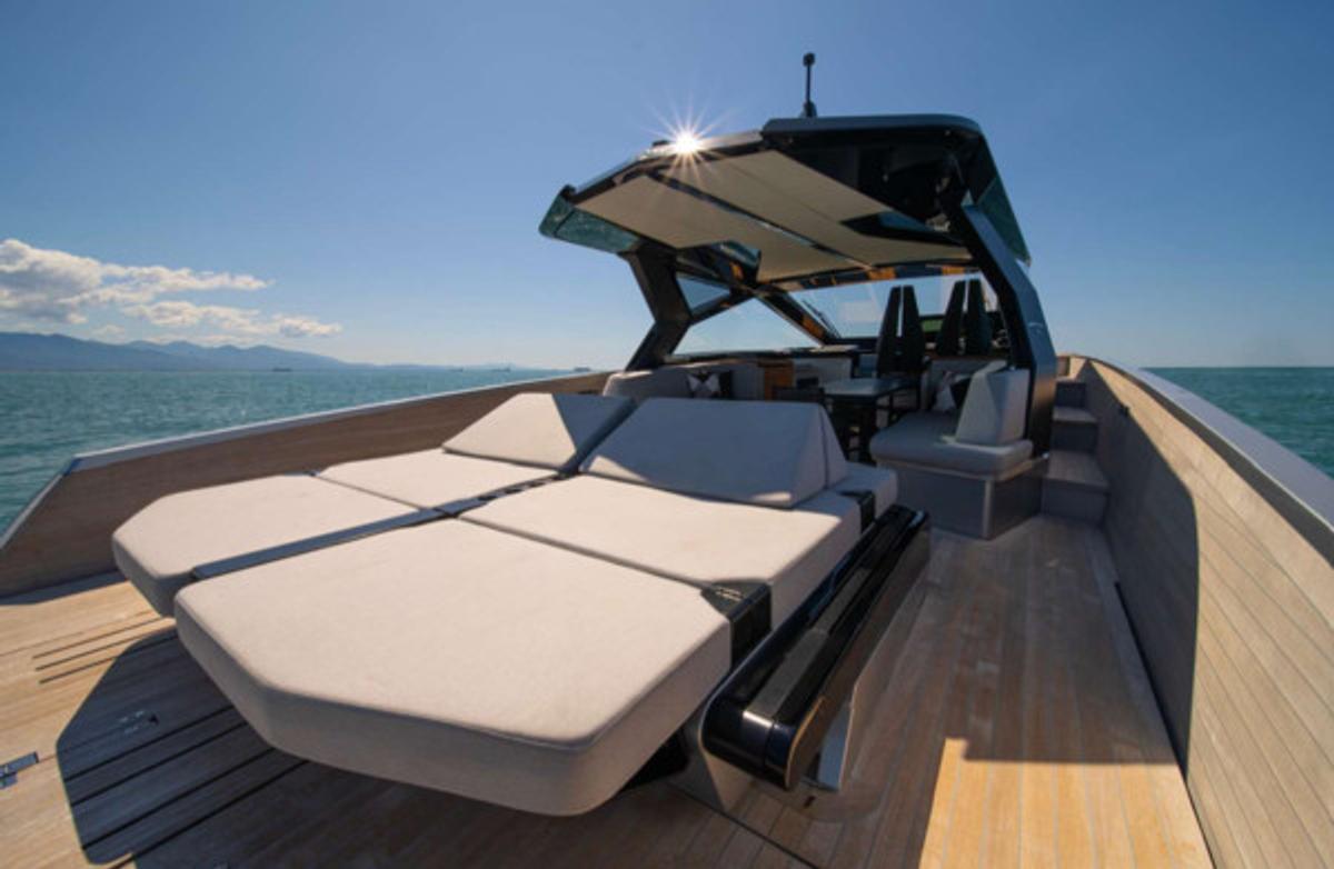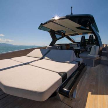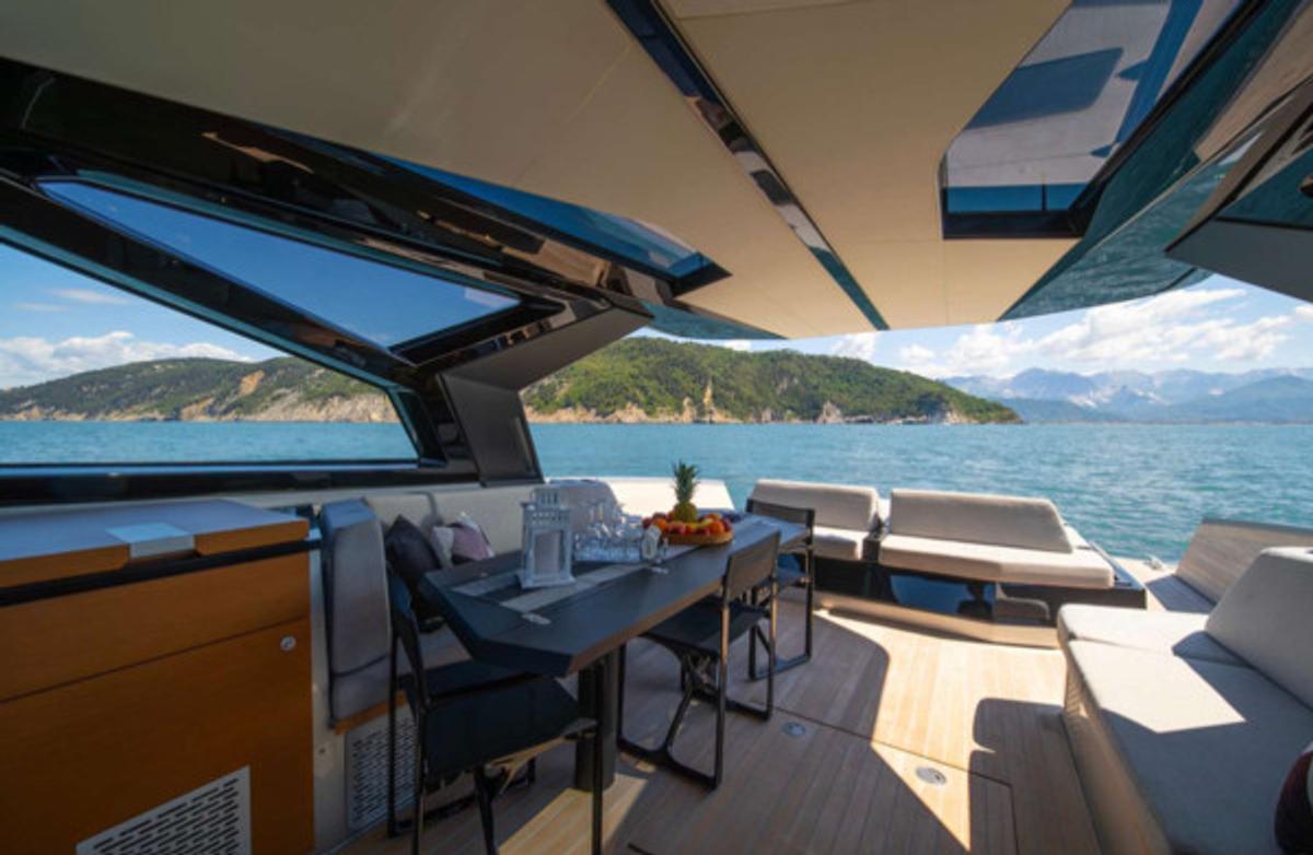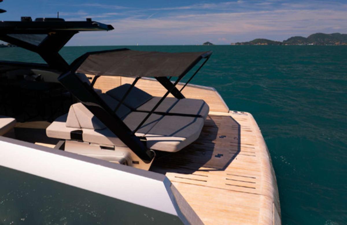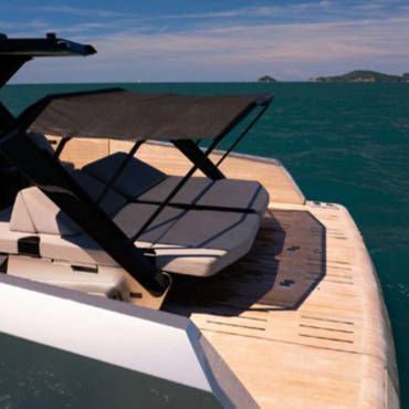 Stylish sunshade for shaded comfort – Spacious bow and stern sundecks for lounging – Comfortable sofa and polygon-shaped dining table – Built-in fridge for refreshments – Bluetooth stereo system – Swimming ladder that doubles as a concealed passerelle – Freshwater shower – Elegant wooden finishes and teak deck – Fold-down rear platform for tender and water access – Hydraulic gangway – Tender on board